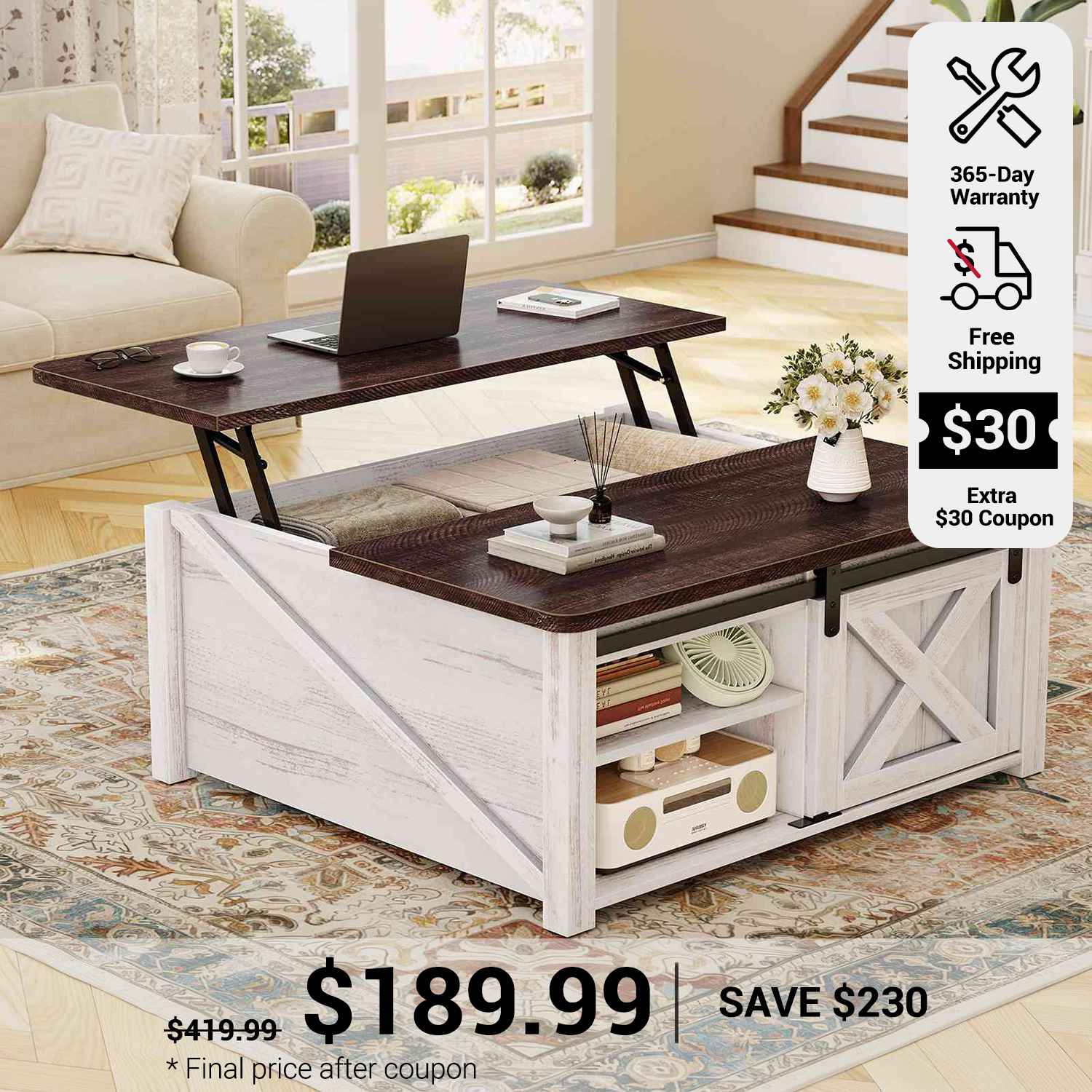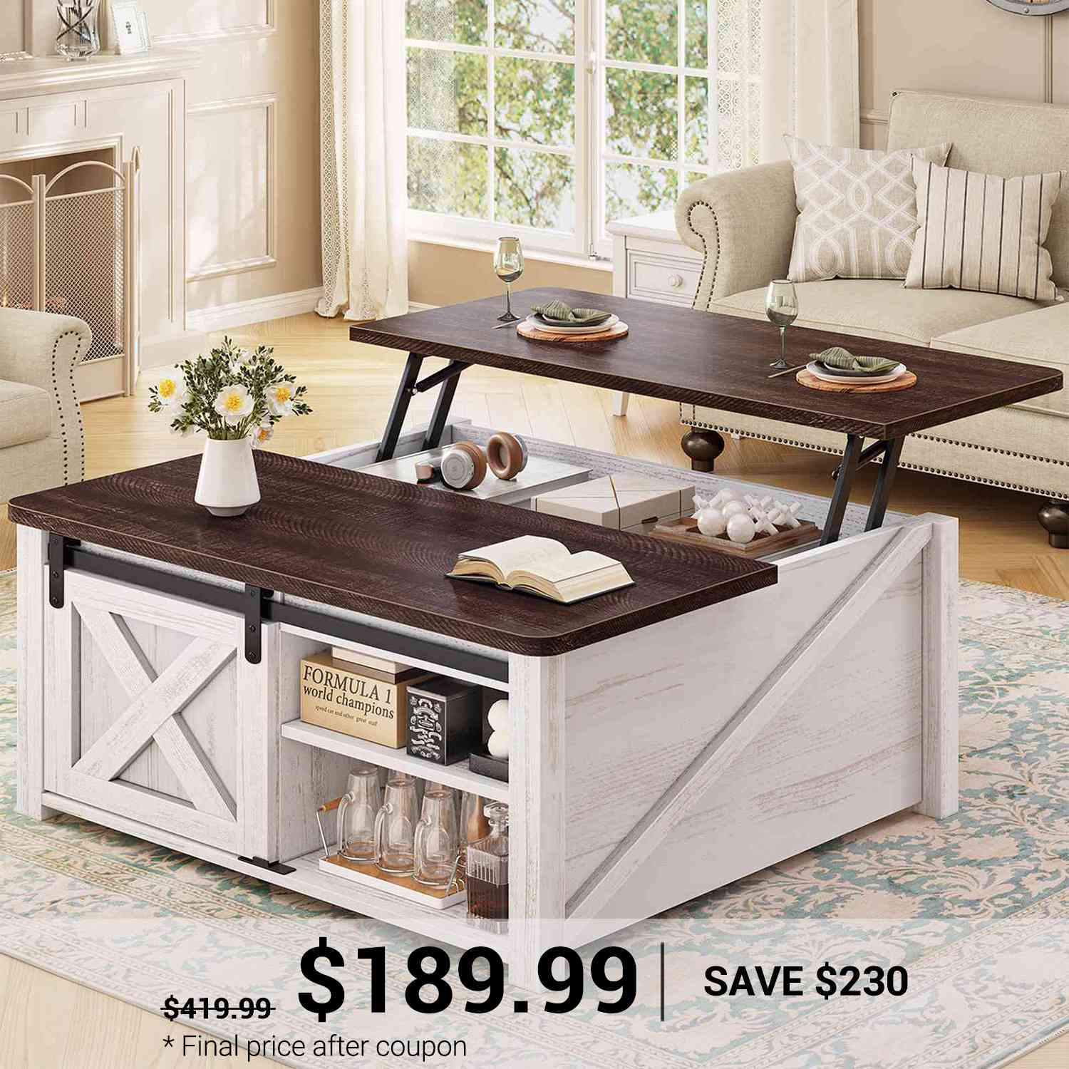 【Practical Lift Top Design】The coffee table experiences smooth and safe lifting with a high-quality lifting mechanism featuring gas struts. Raise the top of this coffee table from 19.7 inches to 25.4 inches and make it easy to work from home, enjoy a meal, do crafts, or play games while sitting comfortably on your couch 【Spacious Storage】This coffee table features a hidden storage compartment under the lift top, keeping all your living room essentials close at hand while keeping clutter at bay. The coffee table's 4 open compartments each feature removable, adjustable shelves (3 height adjustable), allowing you to customize your storage space 【Upgrade Design】High quality lift top mechanism enables the tabletop to be lifted up or lowered down effortlessly and noiselessly, Children don't have to worry about hurting their fingers when using. With solid construction and selected materials, this coffee table will not wobble if correctly assembled 【Farmhouse Coffee Table】The storage coffee table has a waterproof and scratch-proof wood top, more durable than regular square coffee tables. Square coffee table can complement any modern or rustic rooms, highlighting your personal taste and ideals. The unique square shape is just the right size to not only complement your sofa well but also fit well in both small and large spaces 【Easy Assemble & After-sales Service】To make assembling this sturdy coffee table as effortless as possible, we have included clear and detailed instructions, and numbered parts. If your coffee table arrives damaged, scratched, or missing part, please feel free to contact us, we will send you a free replacement or offer a partial refund