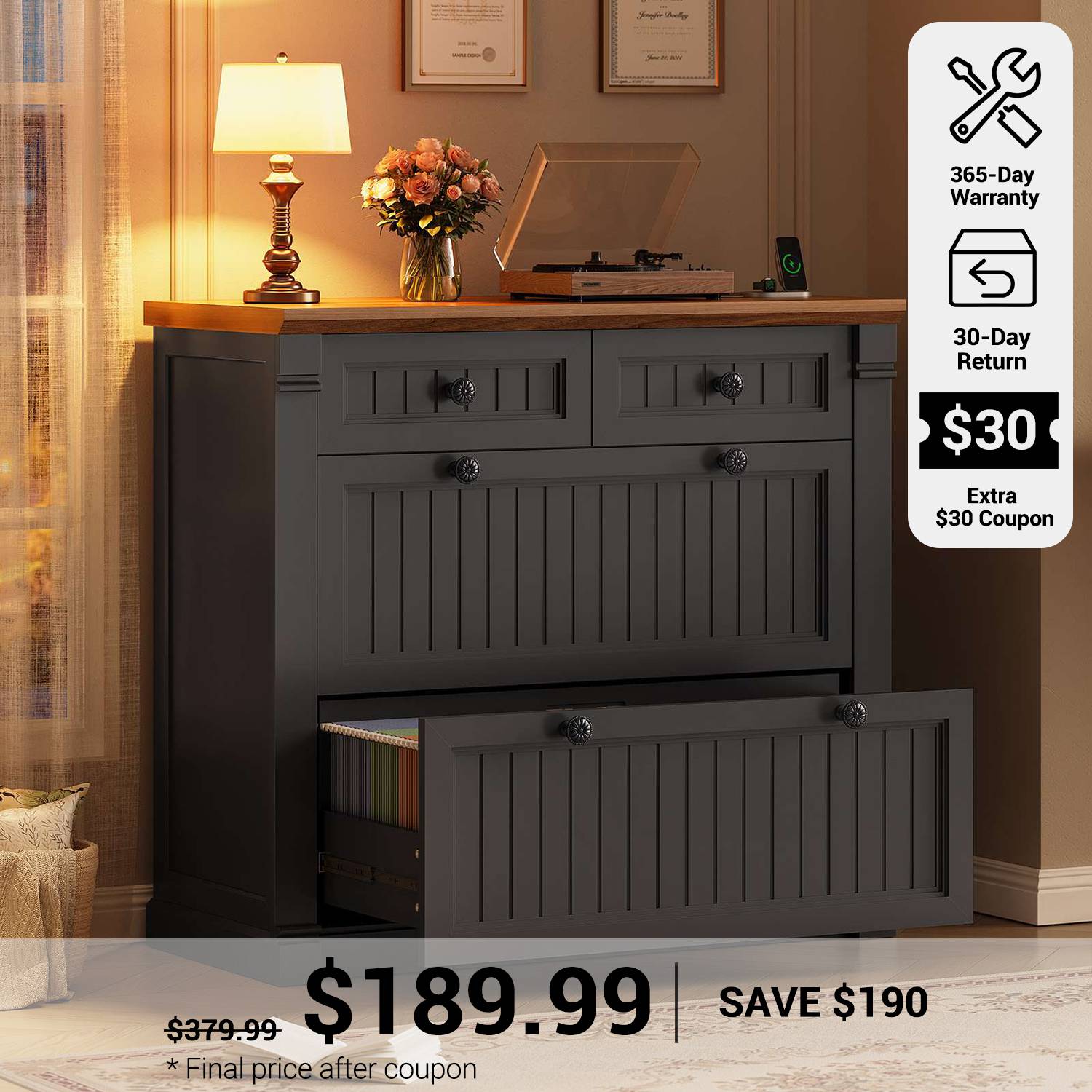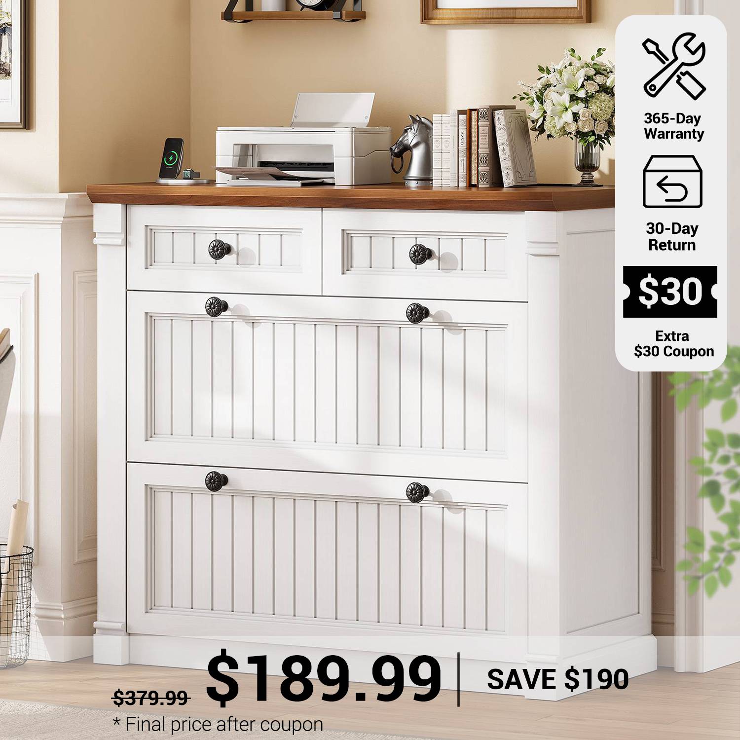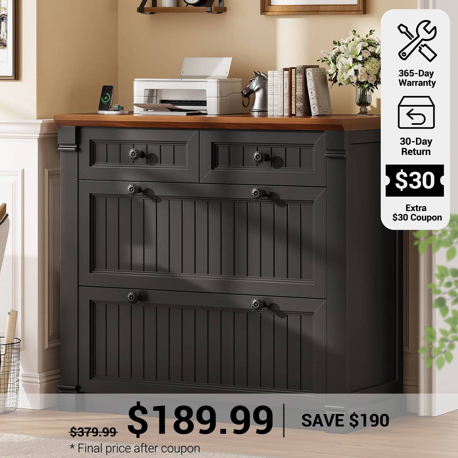 【File cabinet that doubles as your home office’s unsung hero】This filing cabinet features 2 large file drawers for hanging folders and important documents, flexible hanging rods accommodates multiple sizes file: Legal + Letter Size/ Letter+ A4 Size/ Letter + Letter Size/ A4+A4 Size. No more hassle of finding the file cabinet for different file types. Plus 2 small drawers for office supplies, sticky notes, and small gadgets. 【Charging Station】The 4 drawers file cabinet is equipped with 4 sockets and 2 USB ports to power up to 6 devices at the same time. The desktop size of filing cabinets for home office is 33 inches, which is large enough to use 2 machines at the same time, means your espresso machine, printers, scanners, copiers, laptops or other office electronic devices all get VIP outlets. 【Farmhouse Style】This charming farmhouse-style file cabinets for home office showcases vertical stripes for a rustic, elegant look. The printer stand with storage clean lines and textured finish blend seamlessly with bold American styling, industrial-grade MDF, and quiet confidence. Sturdy enough for stylish enough for Zoom backgrounds. 【Multi-scenario application】Wood file cabinet is highly versatile and suitable for various settings. It works well as an office file cabinet for organizing documents, or as a functional chest of drawers in living rooms, bedrooms, or entryways. Its adaptable design allows it to making it perfect for busy home offices or small businesses. Filing cabinet that can be combined with any computer desk to form an L-shaped office area. 【Easy to Assemble】 The drawers of the file cabinet are made of FSC certified wood. Clearly-labeled parts and illustrated instructions make this filing cabinet a breeze to assemble. It's perfect to double as a printer stand with storage in your home office or your study. If your item arrives damaged, scratched or missing part, please feel free to contact us, we will send you free replacement or offer a partial refund.
