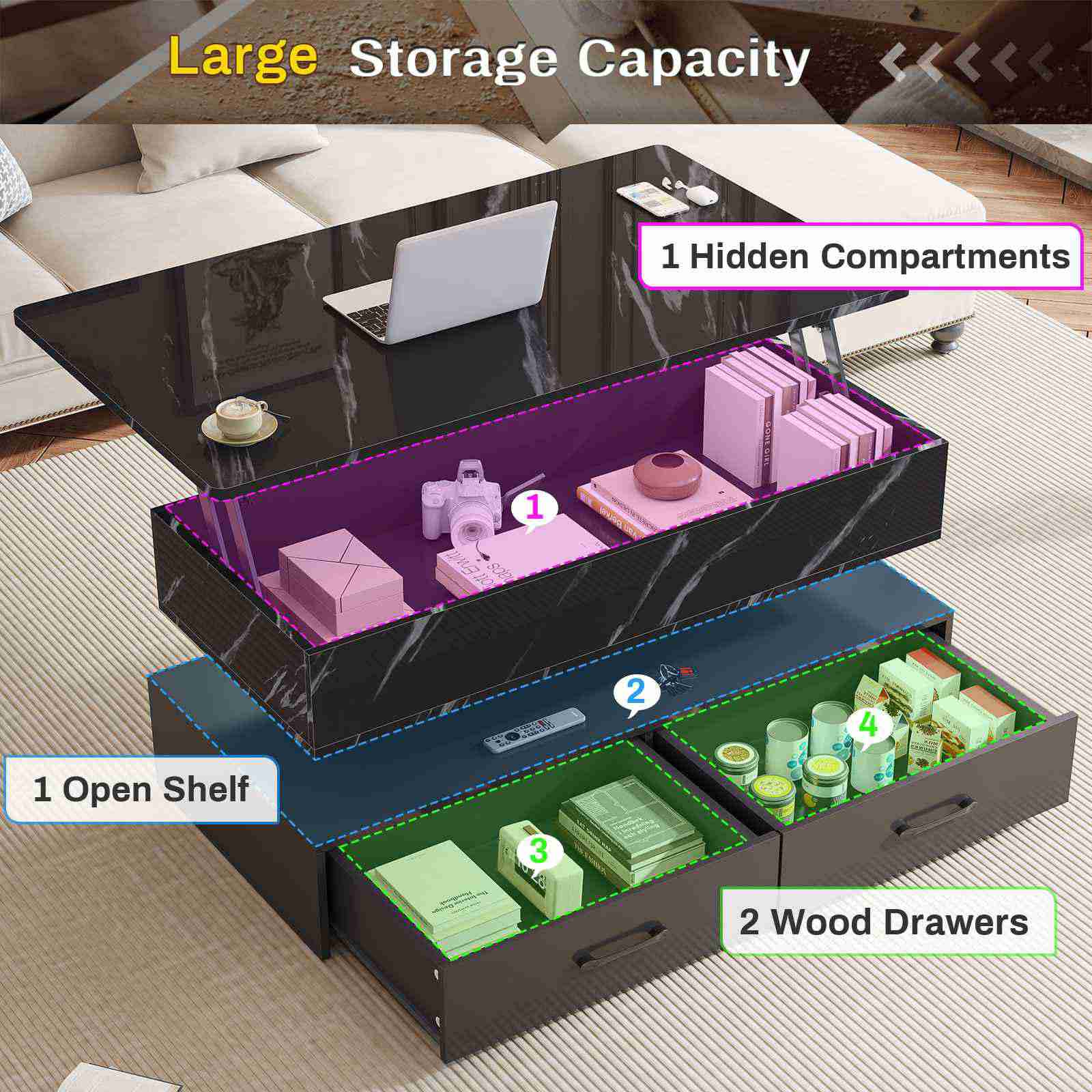 1 hidden compartments allow you to easily organize hidden sundries for a clutter-free living room. 1 big open shelf underneath the coffee table keeps your often-used items handy and tidy. 2 drawers are provided for convenient storage.