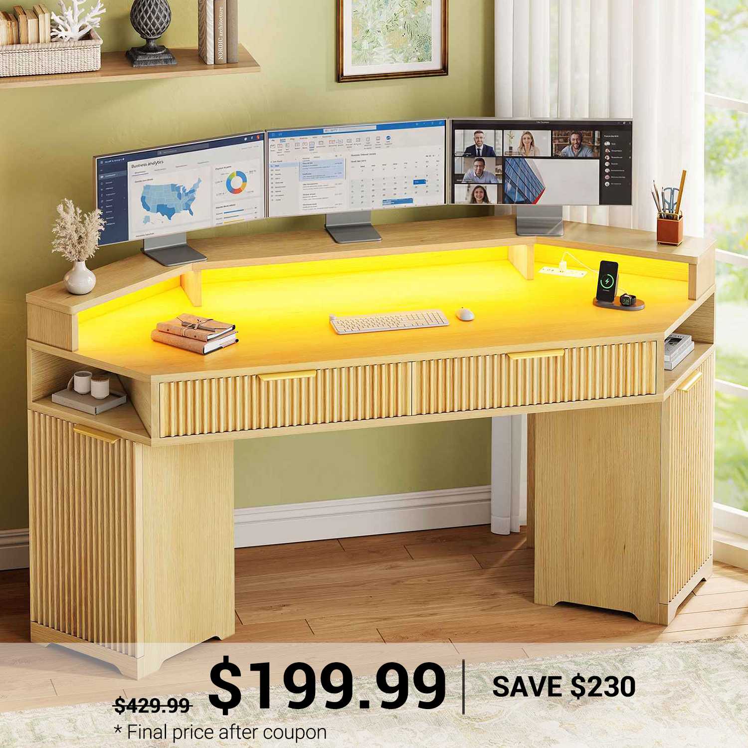 【Large Desktop】The diamond desktop size is 55.1"L*21.7"W. Our computer desk with drawers has a spacious desktop, large enough to accommodate two or three desktop computers desk and lamps. Ideal for multitasking in your home office set up. With the home office desk, you can place both your office and gaming equipment on this office desk with storage at the same time to meet your work and gaming needs. (The angle of the corner table is greater than 90 degrees and cannot perfectly fit a 90 degree wall corner.) 【Ample Storage Space】Where should things be kept when you are studying or working? Computer desk with 2 wood drawers, 2 fluted cabinets, long monitor stand for 2 or 3 desktop computers, 2 open storage. One of the cabinets has adjustable shelf, allowing you to choose whether to install the shelf on the left or right side. Designed with an ergonomic structure, the monitor shelf significantly alleviates pressure on the back and neck. Abundant storage space can meet all your needs! 【Convenient Power Outlet & USB Charging Station】Charge your laptop, phone, or office gadgets with the integrated power outlet and USB ports. Our charging station includes 2 Outlet & 1 USB Ports & 1 type-C Ports to provide power for up to 4 devices simultaneously. No more messy cords or reaching under the desk—everything is built into the upper right corner for easy access. 【Cool & Smart Led Light Strips 】The SEDETA gaming desk comes with RGB LED light strip, remote control via APP, Over 60000 colors and 29 flashing modes for your to choose. Led light strip with music sync function, built-in sensitivity adjustable mic, led light color will change with the rhythm of the sound and music. And with timer function, just enjoy it in a smart way, create gaming and working atmosphere. Light Up Your Gaming with LED Light Strip. 【Easy to Assemble & After-sales Service】To make assembling this sturdy home office desks as effortless as possible, we have included clear and detailed instructions, numbered parts. If your item arrives damaged, scratched or missing part, please feel free to contact us, we will send you free replacement or offer a partial refund.
