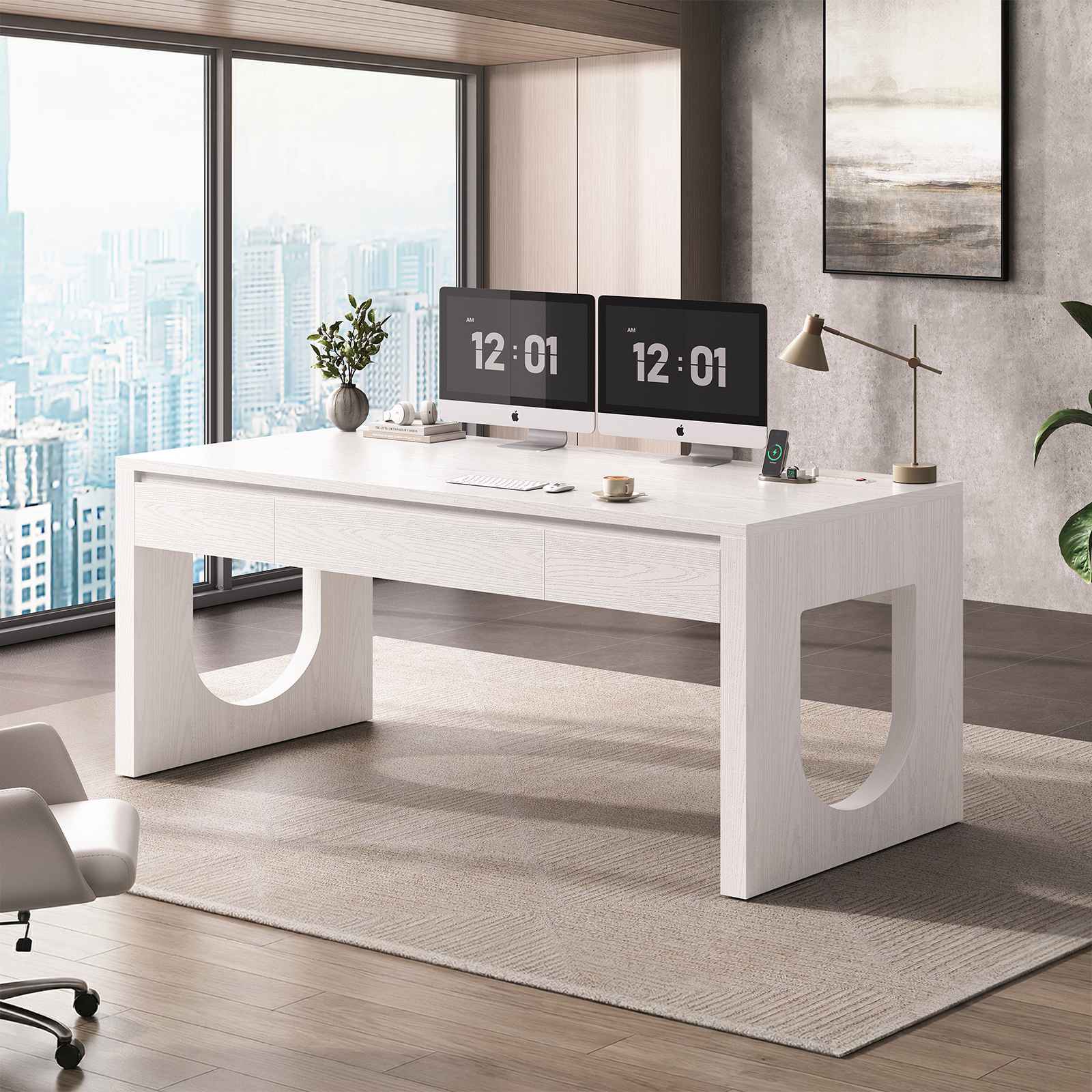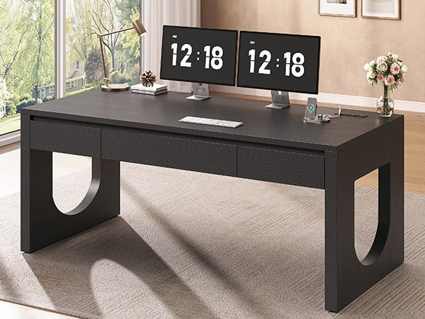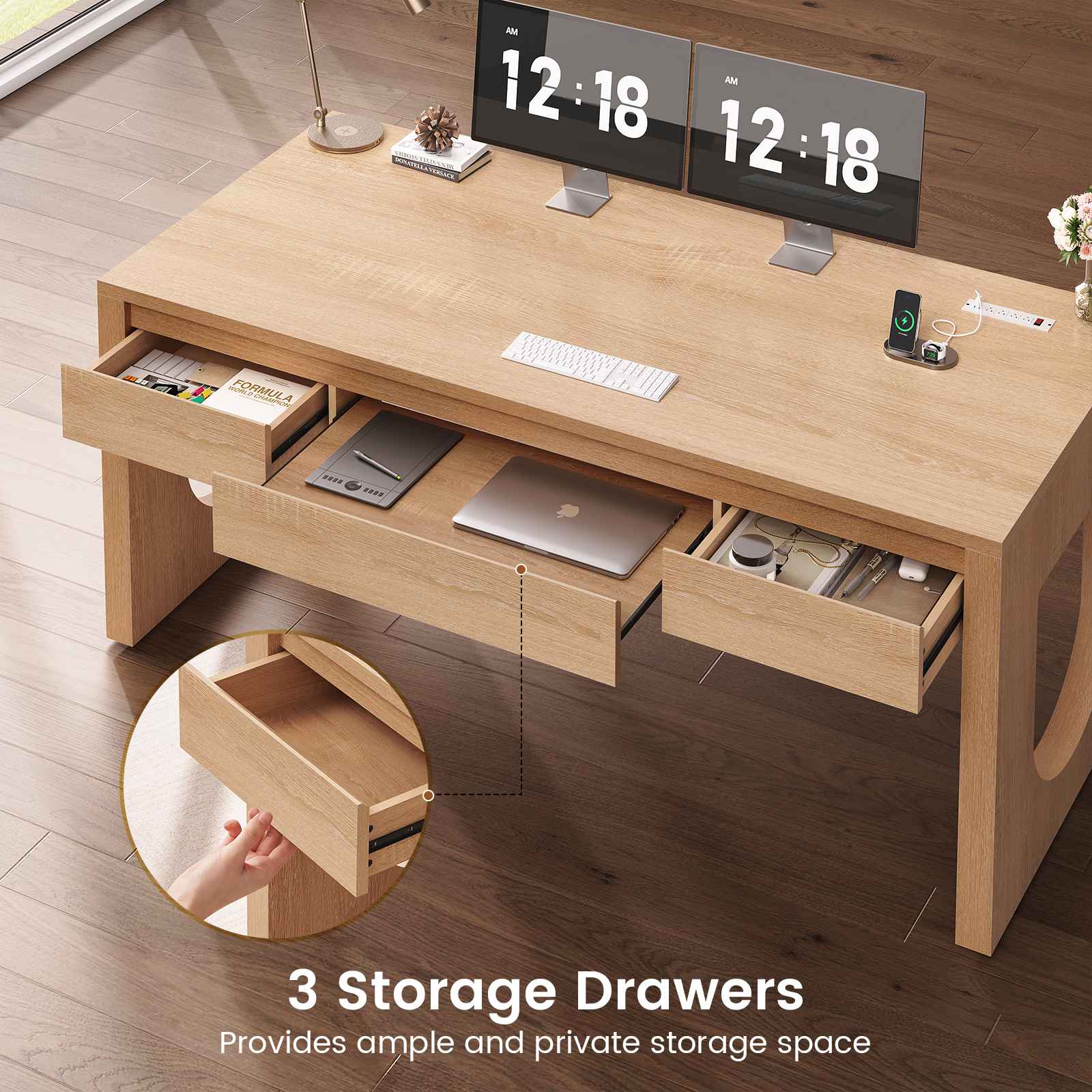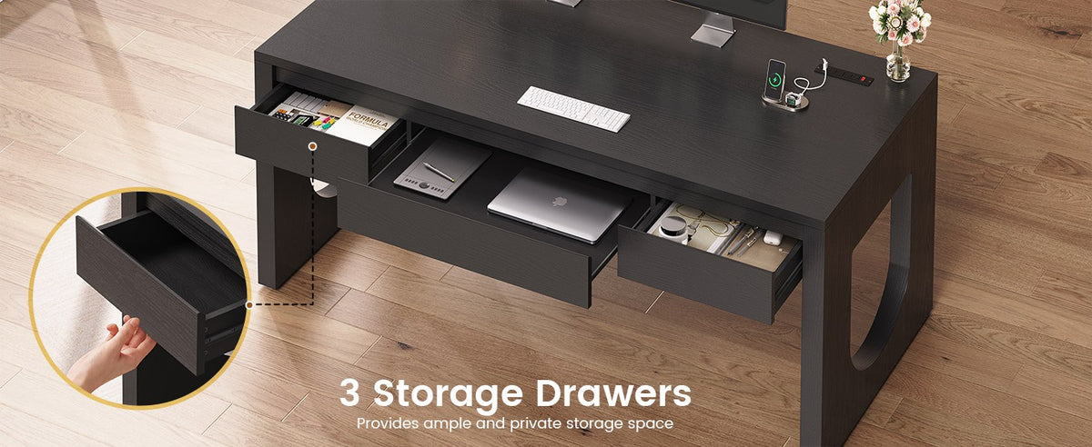 【3 Storage Drawers】This computer desk features three storage drawers. The large middle drawer can hold your laptop and other items, and all drawers use full-length sliding rails. This storage design not only provides you with more private storage space but also saves desktop space. 【Sturdy U-Shaped Legs & Modern Aesthetic】Featuring a distinctive U-shaped leg design, this desk boasts a sleek, contemporary look that elevates any office or home workspace. The thick, solid leg panels offer exceptional structural stability and load-bearing capacity, ensuring the desk remains durable and wobble-free even with heavy daily use. 【Charging Port】Our charging station includes 4-Outlet & 2 USB Ports to provide power for up to 6 devices simultaneously. Also includes an on-off switch, thanks to the on-off switch, one-button power off to ensure safe electricity use, which strengthens security. Power outlet allows you to charge cell phones, tablets, notebooks, etc.Additionally, a cable management hole on the desktop helps organize data cables, keeping your desk tidy. 【Textured Embossed Surface for Tactile Appeal】 The office desk’s embossed wood grain finish creates a tactile, raised texture that mimics the warmth of natural wood while resisting scratches, stains, and fingerprints. This durable surface maintains its elegant appearance over time, adding a touch of sophistication to your home office or study. 【Simple installation & After-sales service】This modern executive desk with drawers comes with very clear instructions and numbered parts for easy assembly. If your executive desk arrives damaged, scratched, or with parts missing, please feel free to contact us and we will replace it for free or provide a partial refund.