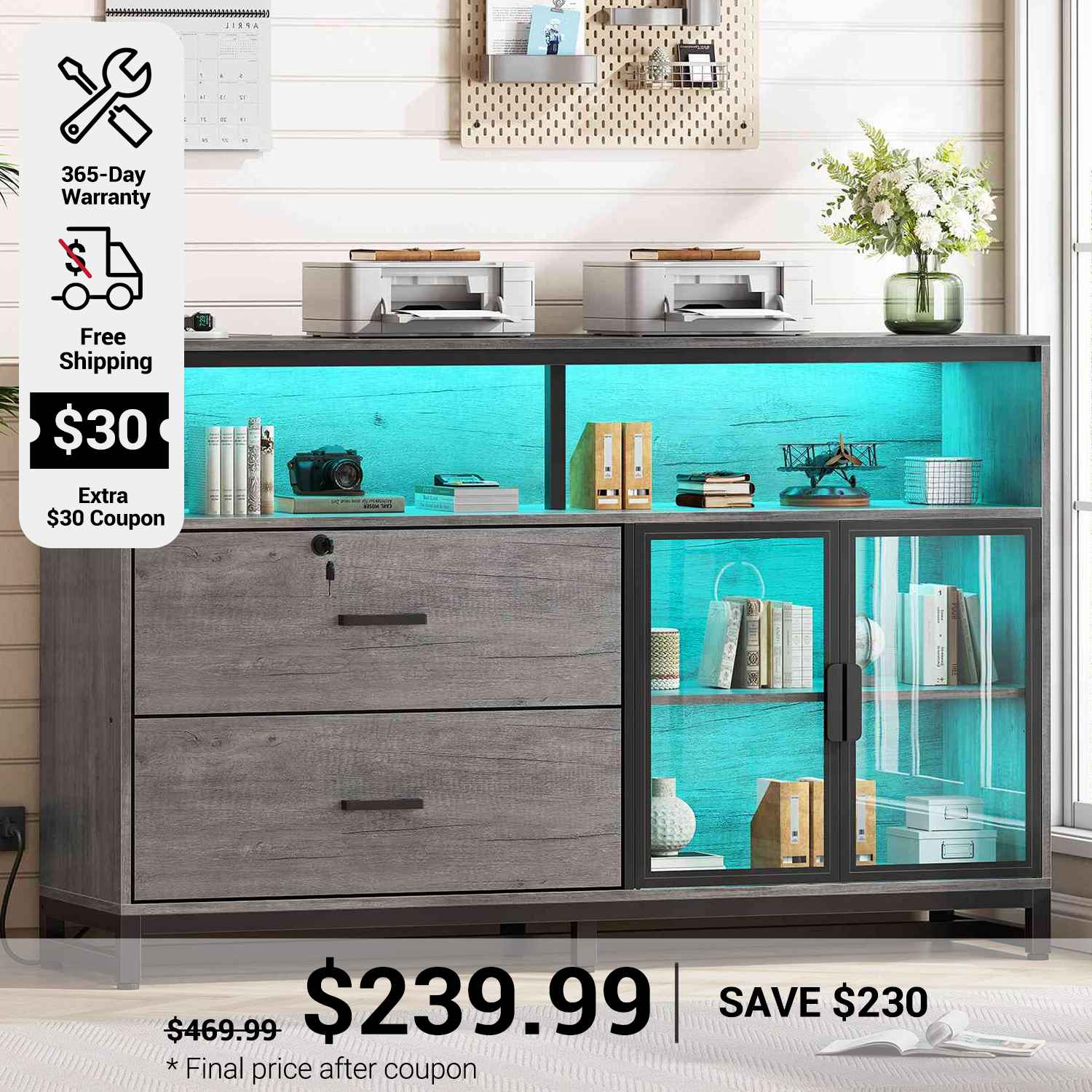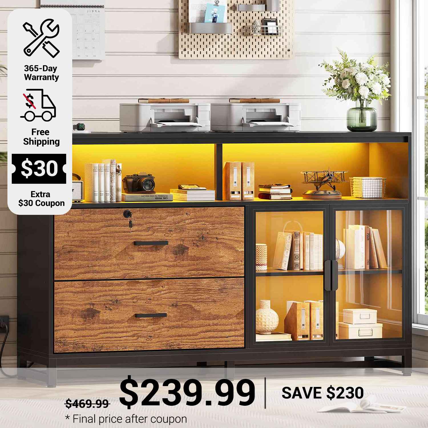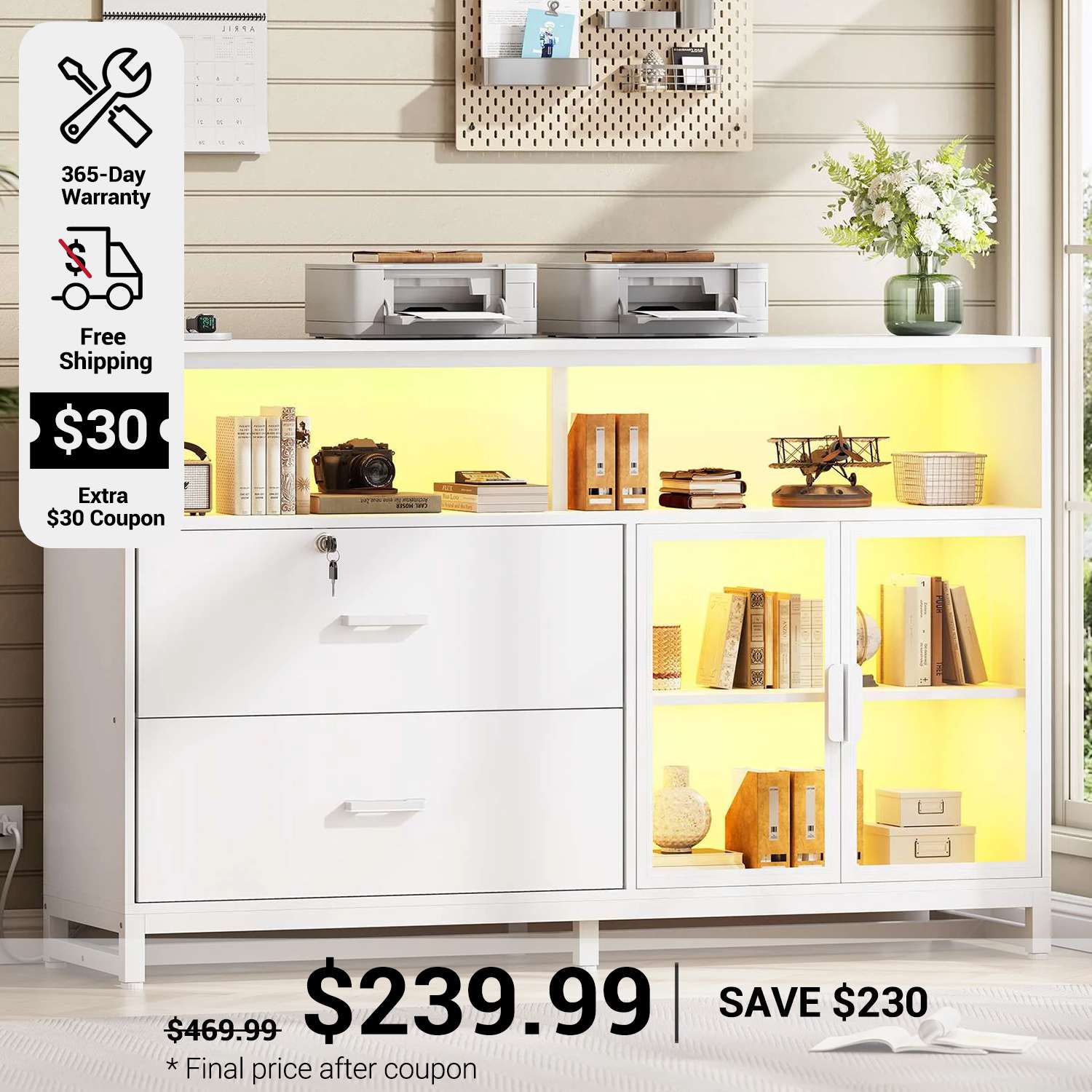 •【What Can You Get?】 The file cabinet has 2 file drawers with 1 lock for Legal, Letter, A4 sizes standard file, power strip for charging 4 devices at the same time, spacious desktop(59"L) large enough for printers and scanners, 4 storage shelves, a pair of acrylic cabinet door for protecte documents and LED light. Filing cabinet that can be combined with any computer desk to form an L-shaped office area.