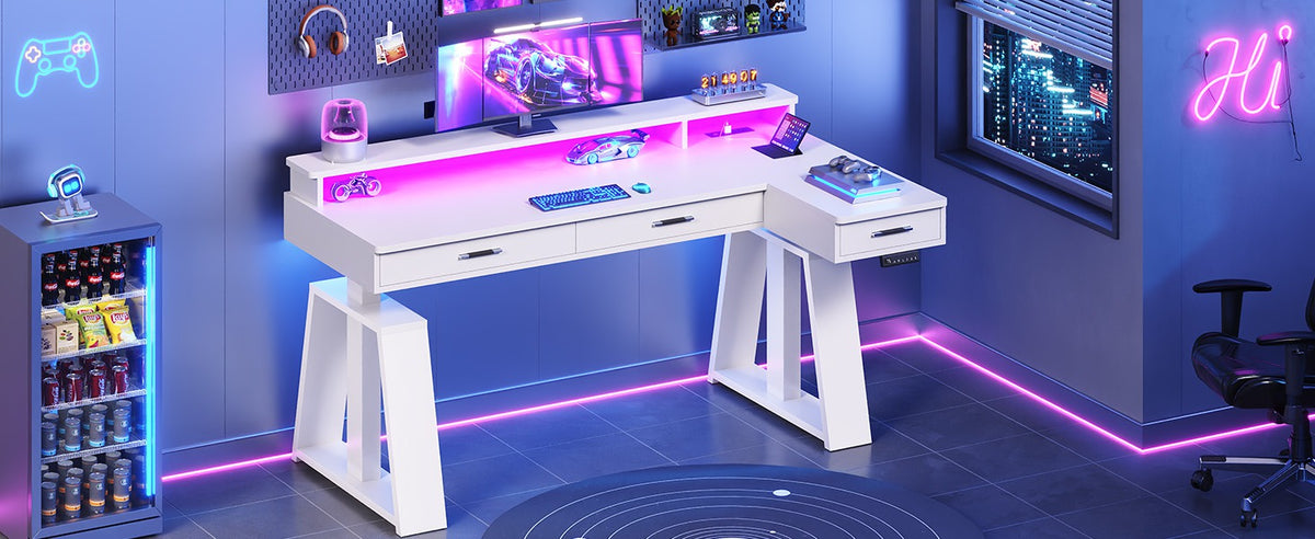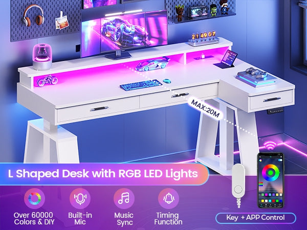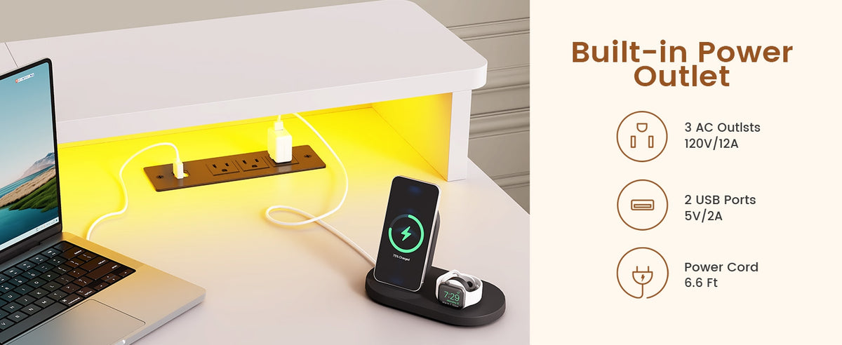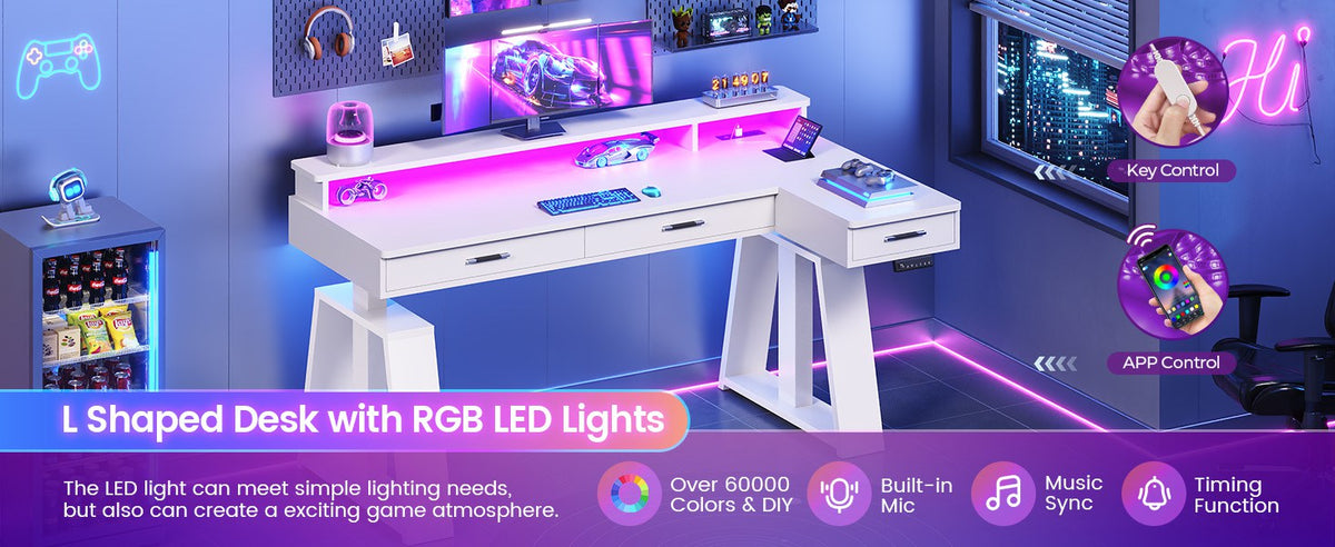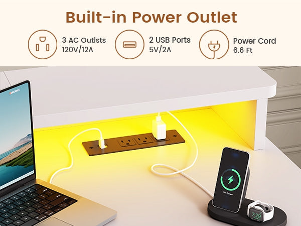 • 【Charging Port & Smart Led Light】This gaming desk with includes a built-in power strip with 4 outlets, 2 USB ports, and 1 Type-C port for charging all your gear—phones, tablets、printer or phone—plus a master switch for safe power control. Integrated smart RGB LED lighting offers 60,000+ colors and 29 dynamic modes, syncs to music via an adjustable mic, and is controllable via remote or app for immersive gameplay or vibrant home office energy.