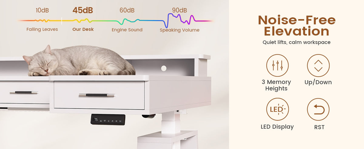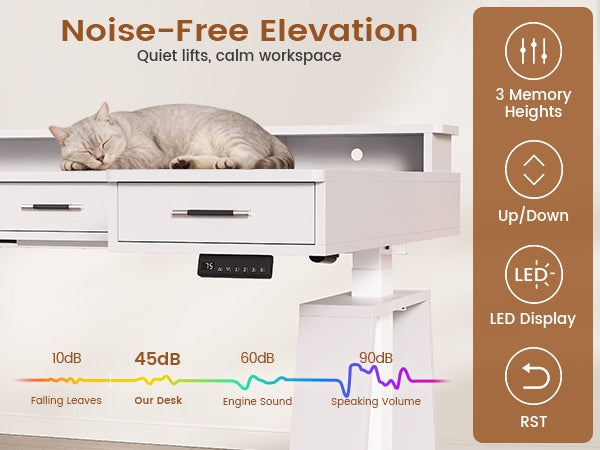 • 【Built to Last with Exceptional Stability】The industrial-grade steel frame and T-shaped design of the l shaped standing desk with drawers support up to 200 lbs. Desktop made of P2 particle board, sturdy durable and anti-scratched. And powered by a robust yet quiet motor (operating at less than 45 DB). If your item arrives damaged, scratched or missing part, please feel free to contact us, we will send you free replacement or offer a partial refund.