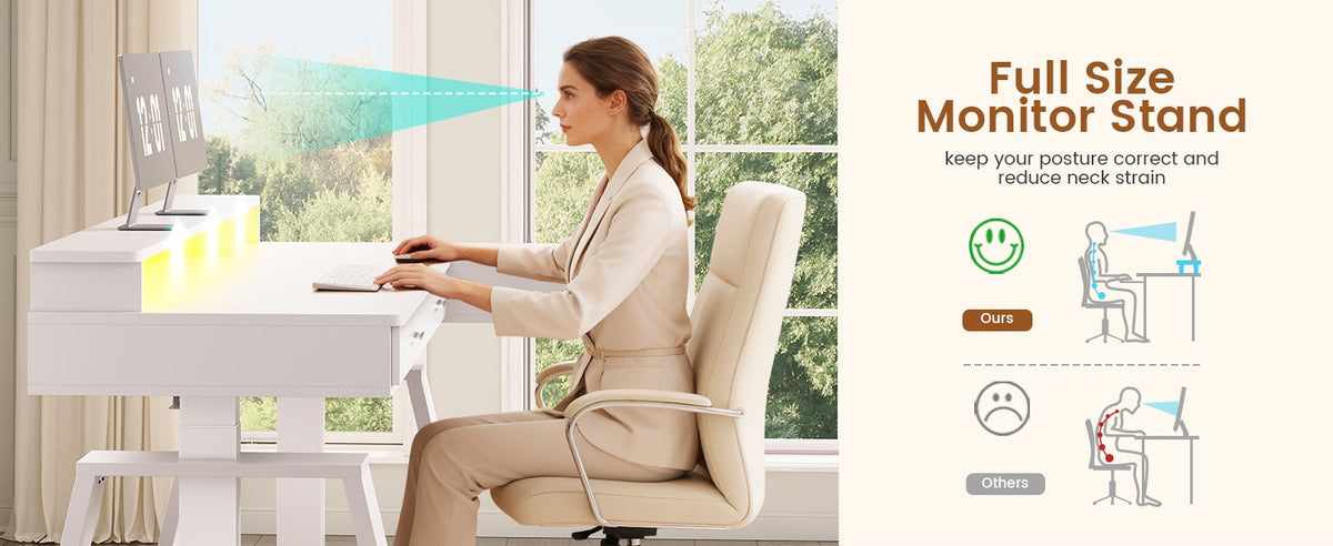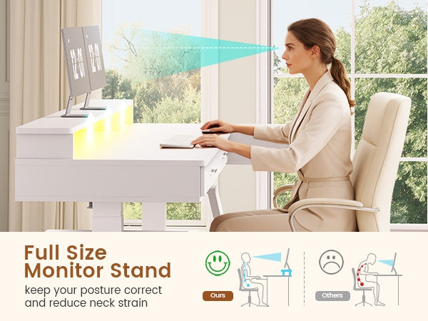• 【For Health】Designed with an ergonomic structure, the monitor shelf significantly alleviates pressure on the back and neck. Its elevated design liberates substantial desktop area, preventing a cluttered or cramped feel. Additionally, the shelf accommodates books, stationery, and other essentials. Safeguard your health and power your efficient workstation.