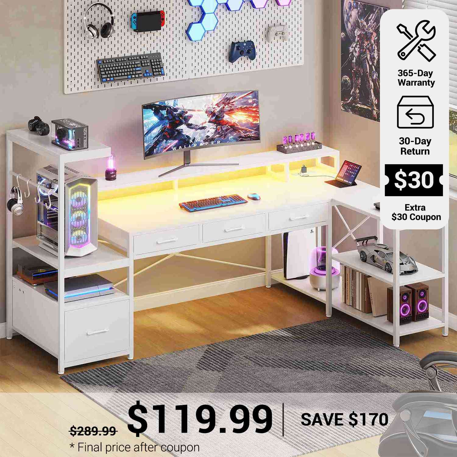 【Showcase Your Rig & Dominate in Style】 This L-shaped gaming desk features a dedicated PC display stand with a tiered design, perfectly showcasing your powerful computer and accessories. It's not just a corner gaming desk—it's your command center! With built-in RGB LED lights, this gaming desk with LED lights creates an immersive atmosphere, making every gaming session feel like a professional tournament. 【Smart Storage for Your Gaming Arsenal】 Stay organized and efficient with this L-shaped desk with storage! It includes 4 fabric drawers—3 for general storage and 1 oversized file drawer for letter/A4/legal documents—plus two spacious open shelves. Everything from controllers to headsets has its place, ensuring your gaming gear is always within reach. This L-shaped desk with drawers keeps your space tidy so you can focus on victory. 【Adaptable & Spacious Reversible Design】 Flexibility meets function in this reversible L-shaped desk! Configure the setup to fit left or right corners, adapting to any room layout. The generous 59" + 39.3" desktop offers ample space for two desktop computers and a laptop—ideal for streaming, multitasking, or teaming up with a friend. Whether used as a single gaming desk or a shared workstation, it delivers comfort and convenience. 【 Built-In Power & Ergonomic Monitor Stand】 Power up without the cord chaos! This desk integrates a practical power solution—2 outlets and 2 USB ports—right where you need it. Plus, the adjustable monitor stand lifts your screen to an ergonomic height, reducing neck strain during long gaming or work sessions. It's the perfect L-shaped gaming desk for maintaining both posture and performance. 【Durable Build for Intense Gaming Sessions】 Crafted with a sturdy metal frame and scratch-resistant, waterproof MDF, this L-shaped gaming desk is built to last. Adjustable non-slip feet ensure stability on any floor, so you can game with confidence. Whether it's in your bedroom, living room, or dedicated game room—this desk is ready for action 24/7!
