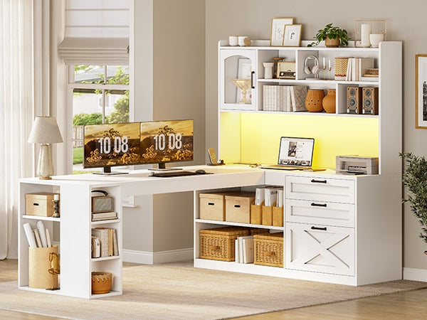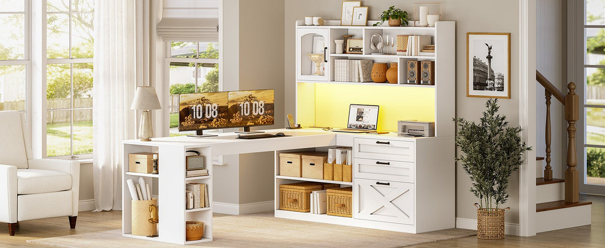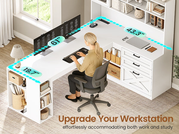 【Ample Storage Solutions】This l-shaped desk with drawers includes 2 wood drawers—plus one file drawer that holds Letter/A4/Legal folders! The 10 open storage and a cabinet door cabinets for easy access and a relaxed rustic look. Ideal for keeping your living room, bedroom, or office tidy and organized. 【Gaming Desk with LED Lights & Glass Cabinet】Enhance your setup this l shaped gaming desk with LED lights! It includes a glass display cabinet to showcase your collectibles, plus a vibrant RGB LED strip. Control over 60,000 colors and 29 lighting modes via the remote or app to create the ambiance for gaming or working. 【Integrated Power Strip & Expensive Desks】The corner office desk includes a built-in surge protector with 4 outlets, 2 USB ports, and a handy on/off switch. The spacious desktop (61” + 43.3” long) holds 2 PCs and a laptop, and an ideal gaming desk for small rooms to create excellent home office space. 【Farmhouse L Shaped Desk】Information about the farmhouse style elements of this desk makes it a perfect addition to any home. Create a one-of-a-kind work environment when you add sophisticated charm and design of this L-shaped desk from the collection. This computer desk will have your office space looking good in no time. 【After-sales Service】To make assembling this sturdy home office desk as effortless as possible, we have included clear and detailed instructions, numbered parts. If your item arrives damaged, scratched or missing part, please feel free to contact us. Our customer support team will address your concerns within 24 hours.