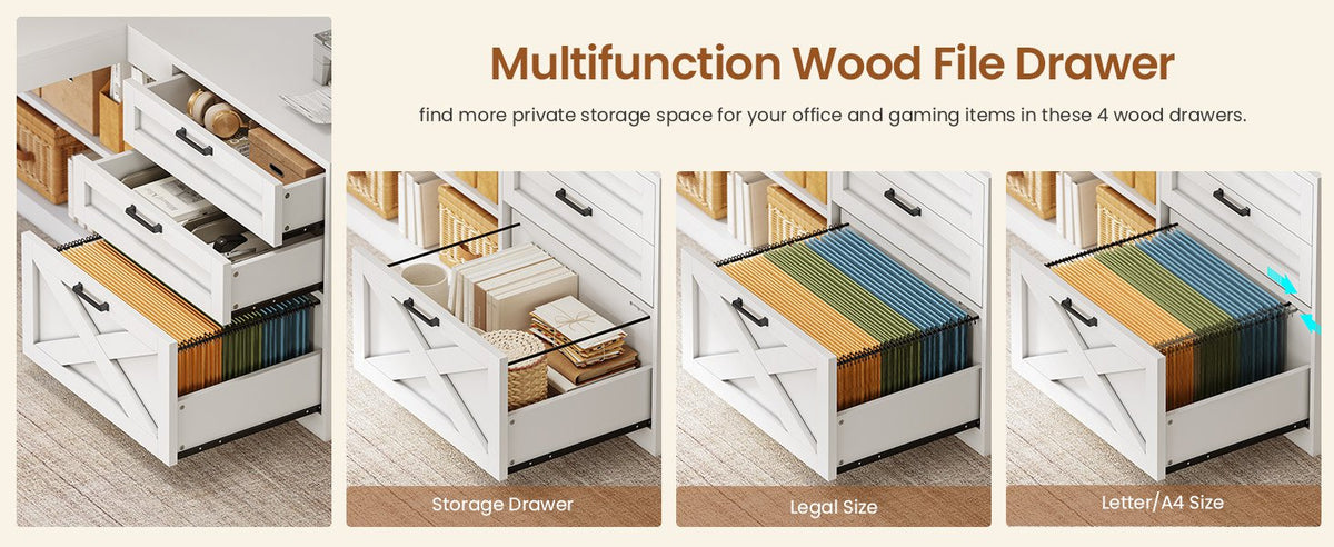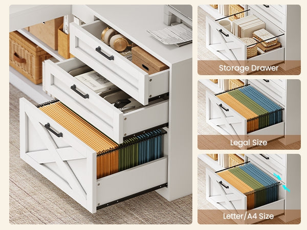 • Ample Storage: 2 wood drawers, 1 file drawer (Letter/A4/Legal), 10 open shelves, and cabinet doors.