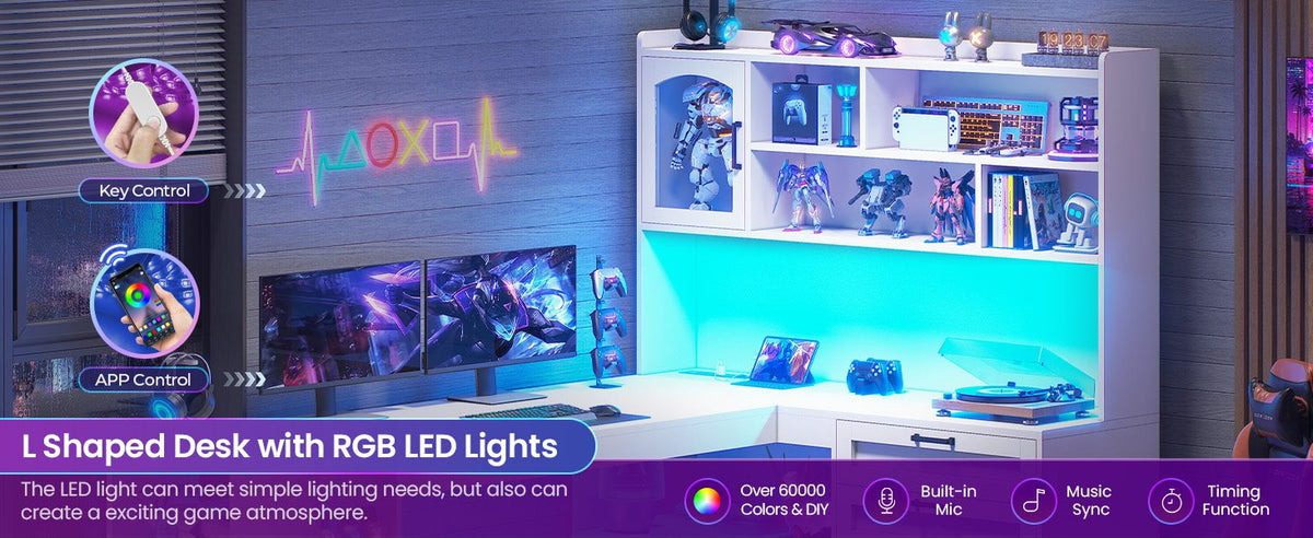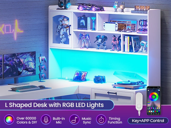 •【Gaming Desk with LED Lights & Glass Cabinet】Enhance your setup this l shaped gaming desk with LED lights! It includes a glass display cabinet to showcase your collectibles, plus a vibrant RGB LED strip. Control over 60,000 colors and 29 lighting modes via the remote or app to create the ambiance for gaming or working.