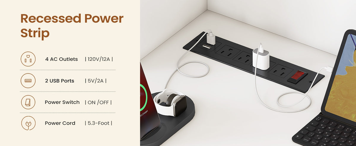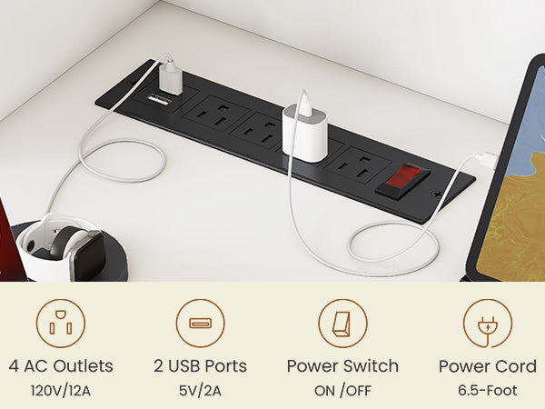 • Built-in Power Supply: Integrated surge protector with 4 outlets, 2 USB ports, and on/off switch for convenient charging and cable management.