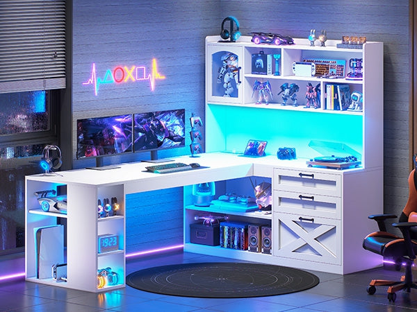 SEDETA 61 Inch Farmhouse Gaming Desk L Shaped Office Computer Desk with Display Cabinet Drawers Storage Shelves LED Light Power Outlet
