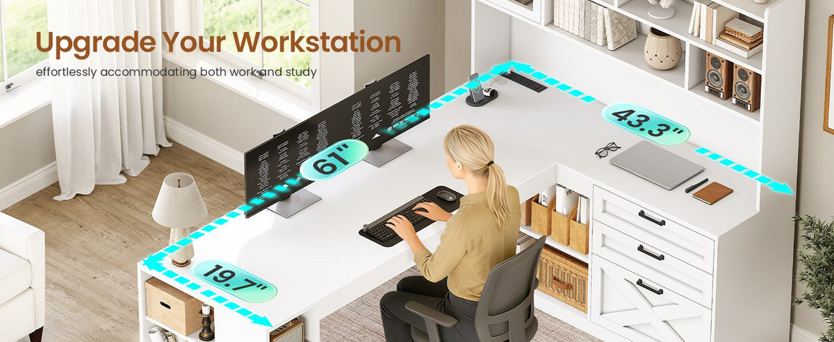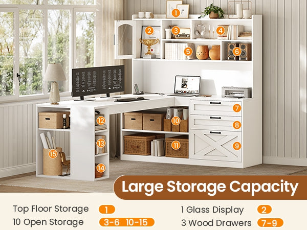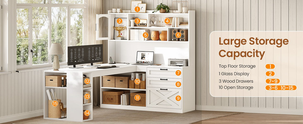 • Farmhouse Design & Support: Farmhouse-style L desk with sturdy construction, clear instructions, numbered parts, and responsive after-sales service.