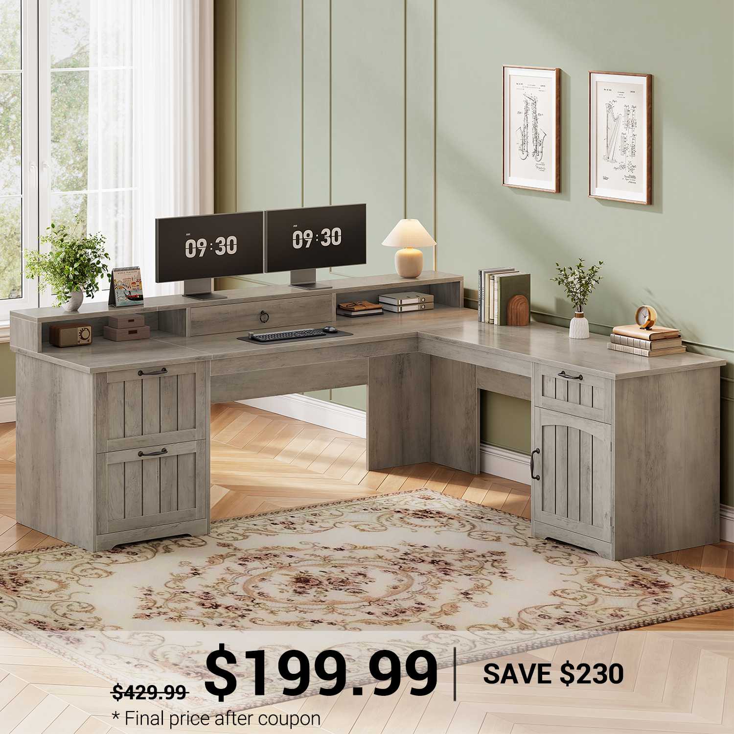 SEDETA® 63 Inch Farmhouse L Shaped Computer Desk Wood Ergonomic Office Desk with Storage File Drawers Monitor Stand