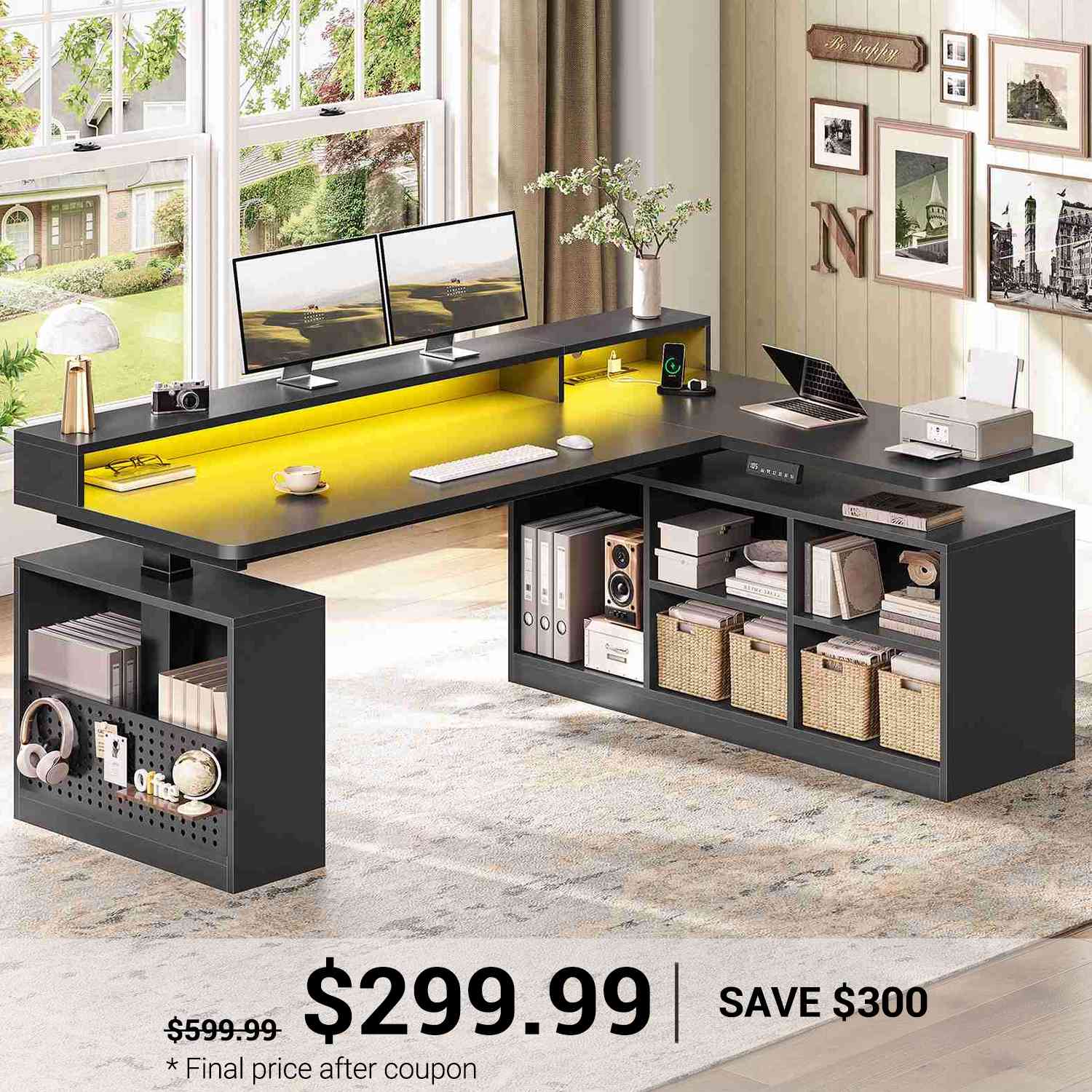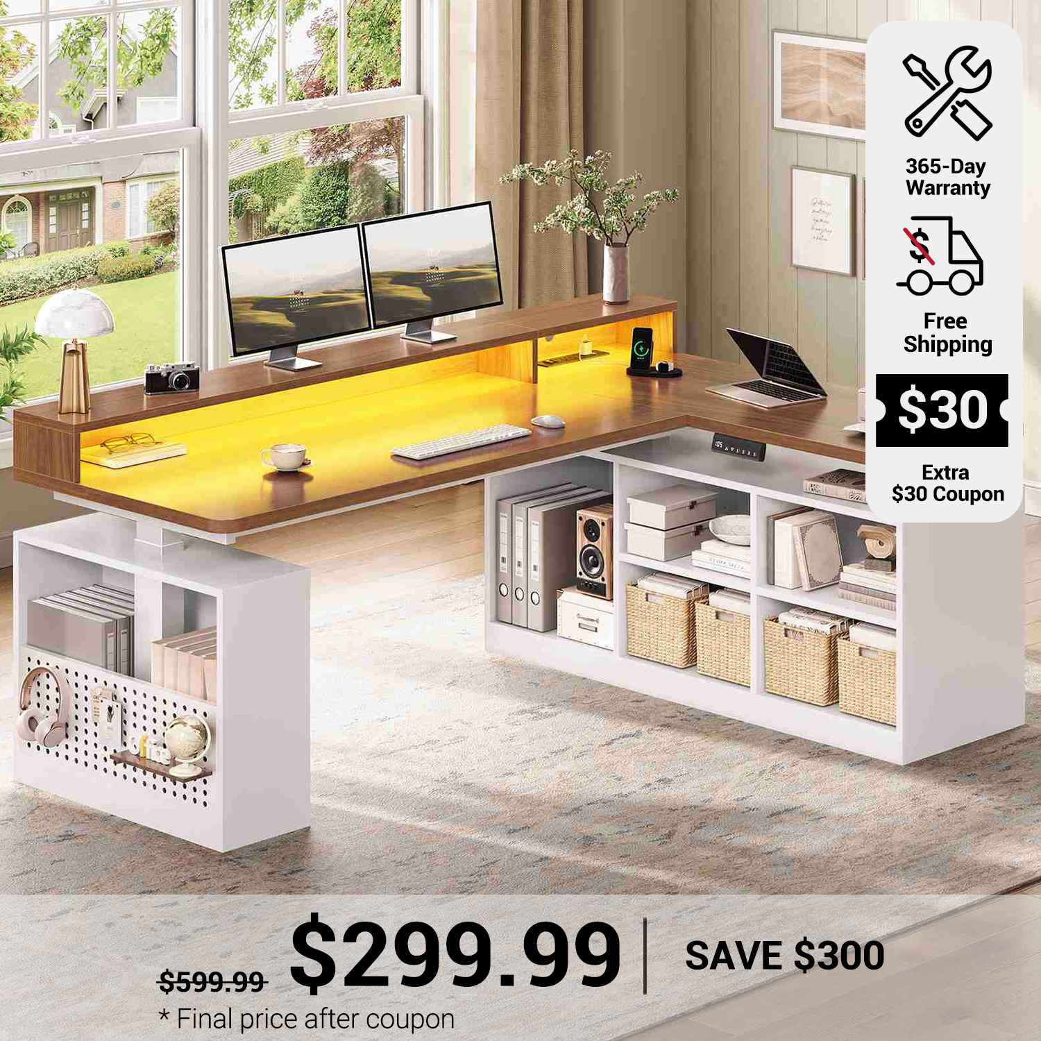 【Ample Storage Space】The 63 inch x 39.3-inch l shaped standing desk provides a spacious workspace. Equipped with side peg board, open storage shelves, and full size monitor stand for files, office supplies, or gaming devices. Ideal for keeping your living room, bedroom, or office tidy and organized. 【Adjustable Height Standing Desk】The adjustable computer desk with storage height adjusts infinitely from 28.3 to 47 inches, with a memory function to save 3 favorite settings. It helps you find the perfect height for better posture, while the high-quality motor ensures durability, quiet operation, and a longer lifespan. 【Led Light Strips and Power Outlet 】The l shaped gaming desk comes with RGB LED light strip, remote control via APP, Over 60000 colors and 29 flashing modes for your to choose. And the power outlet with four power sockets and two USB ports is convenient charging of your devices. 【Full-size Monitor Stand】This electric standing desk stand features an ergonomic design to improve your posture, reduce back and neck strain, and provides extra storage space for your work, gaming, and study supplies. The monitor stand could place some books, sticky notes, paper, pens and any other home office things. 【Superior Quality】This electric standing desk features a powerful lifting system that ensures smooth and quiet operation. Its powerful motor can support up to 220 pounds (approximately 100 kg), with a smooth lifting speed of 25 mm/s and a noise level below 30 decibels.The desktop of this standing desk is made of FSC-certified wood. 【After-sales Service】Thank you for your support and trust for our home office desk. We have a professional after-sales customer service team. If your corner desk arrives damaged, scratched or missing part, please feel free to contact us.