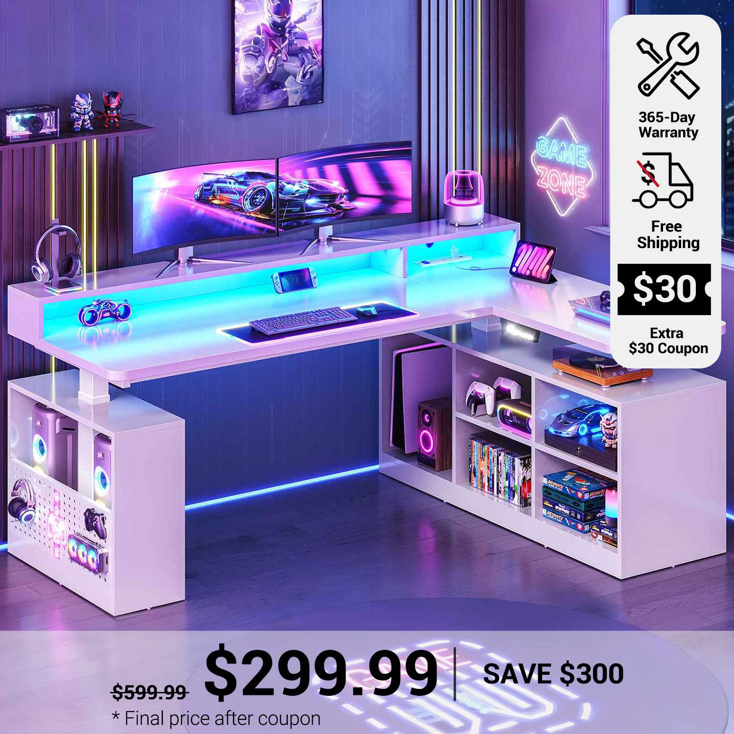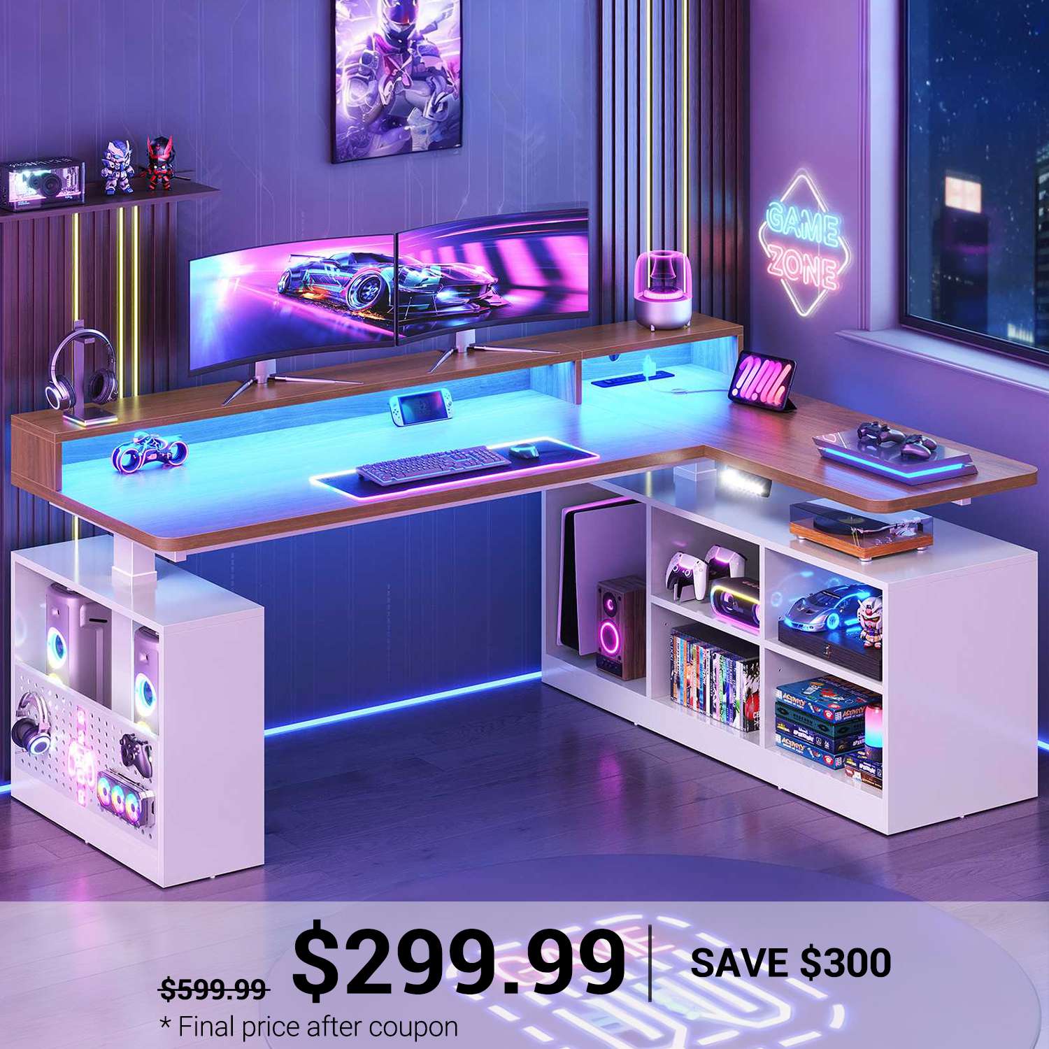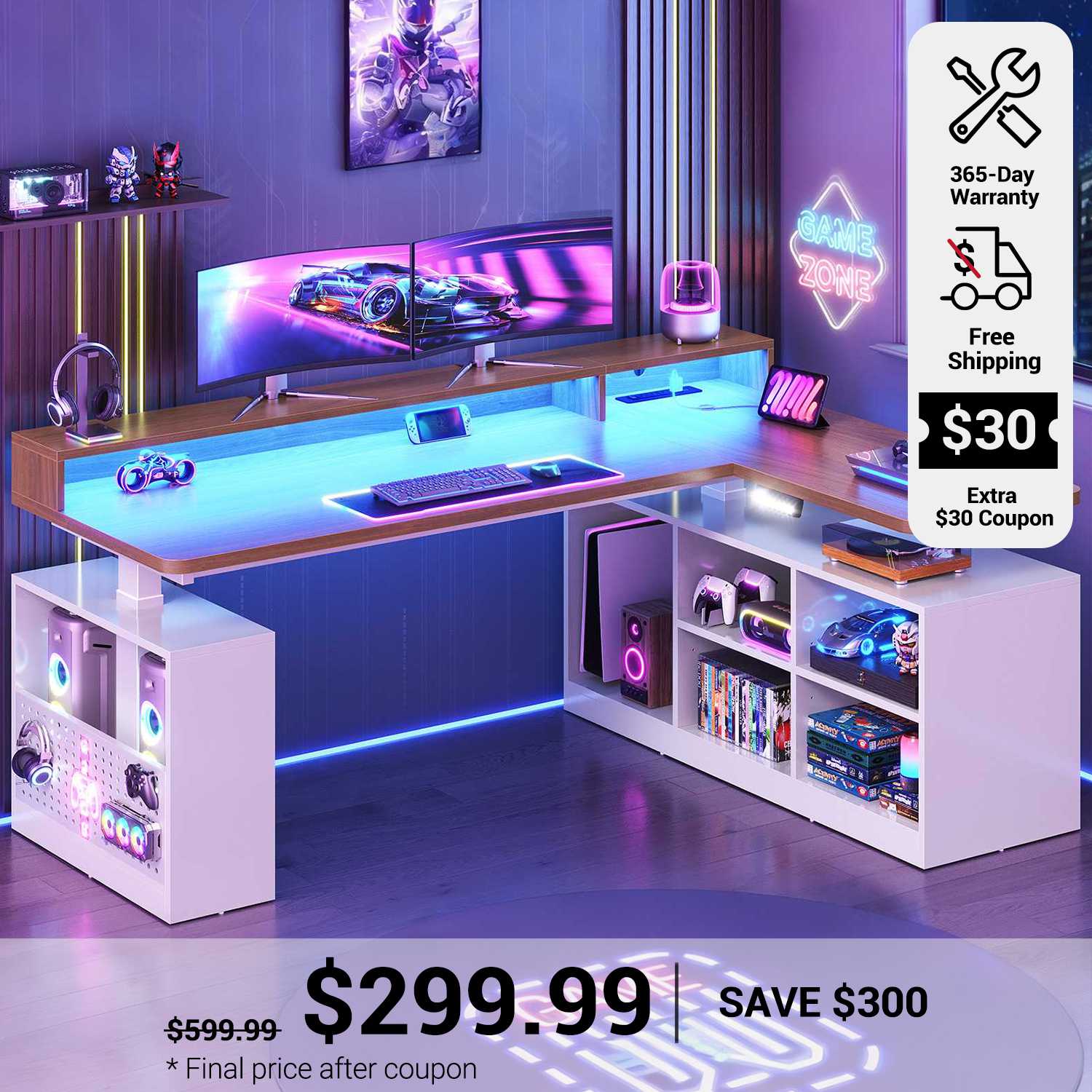 •【Led Light Strips and Power Outlet 】The l shaped gaming desk comes with RGB LED light strip, remote control via APP, Over 60000 colors and 29 flashing modes for your to choose. And the power outlet with four power sockets and two USB ports is convenient charging of your devices.