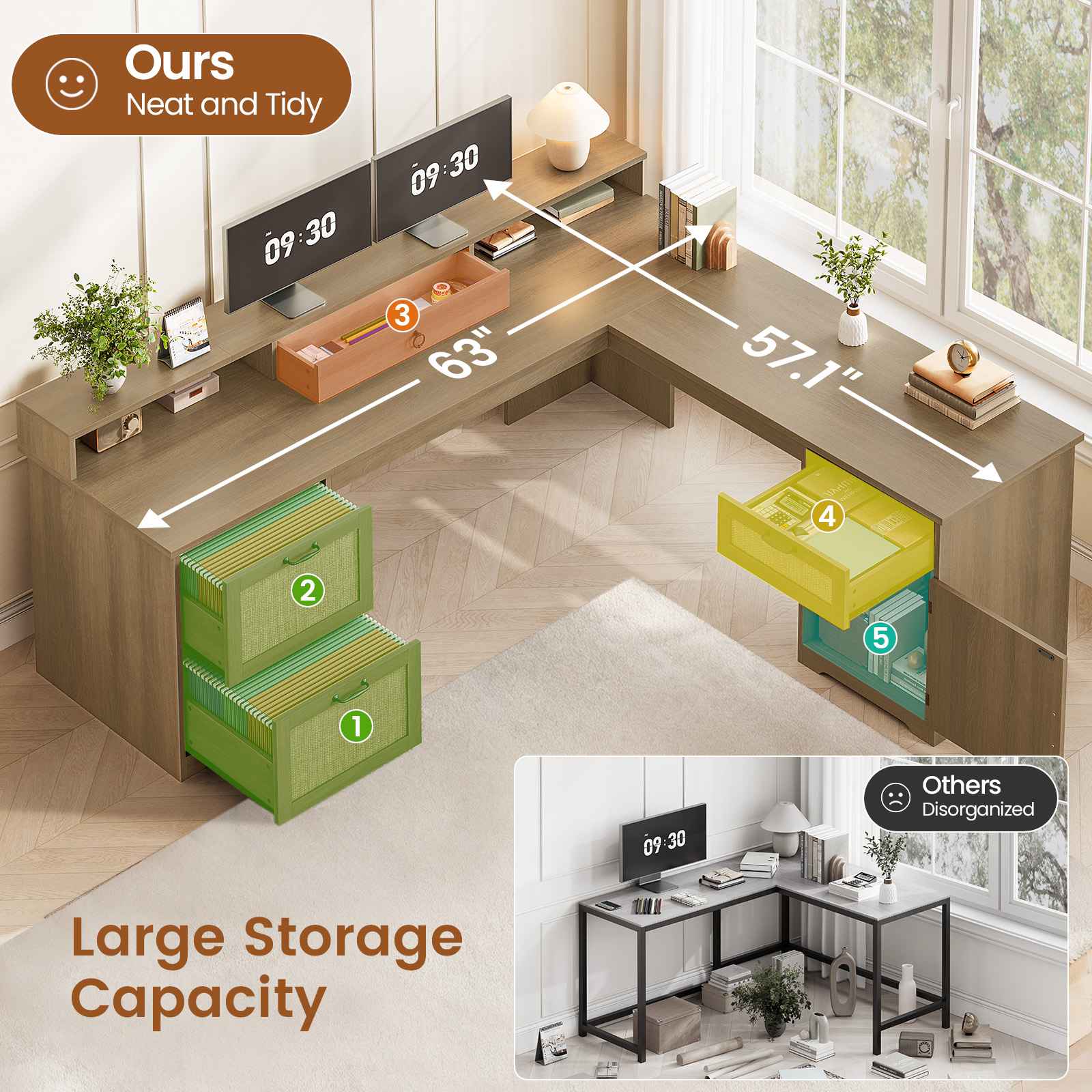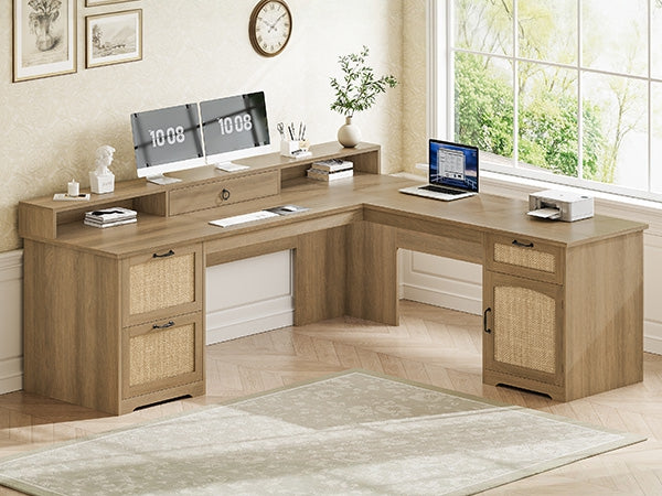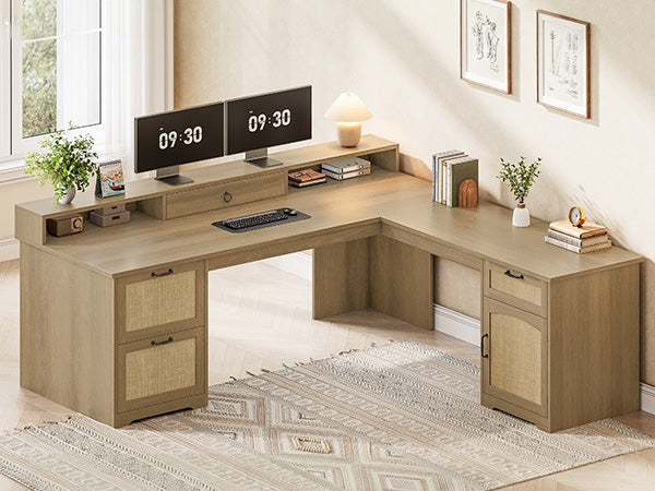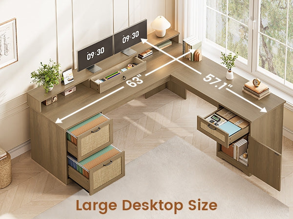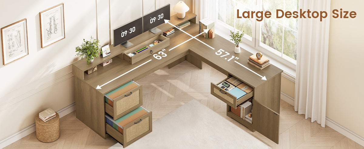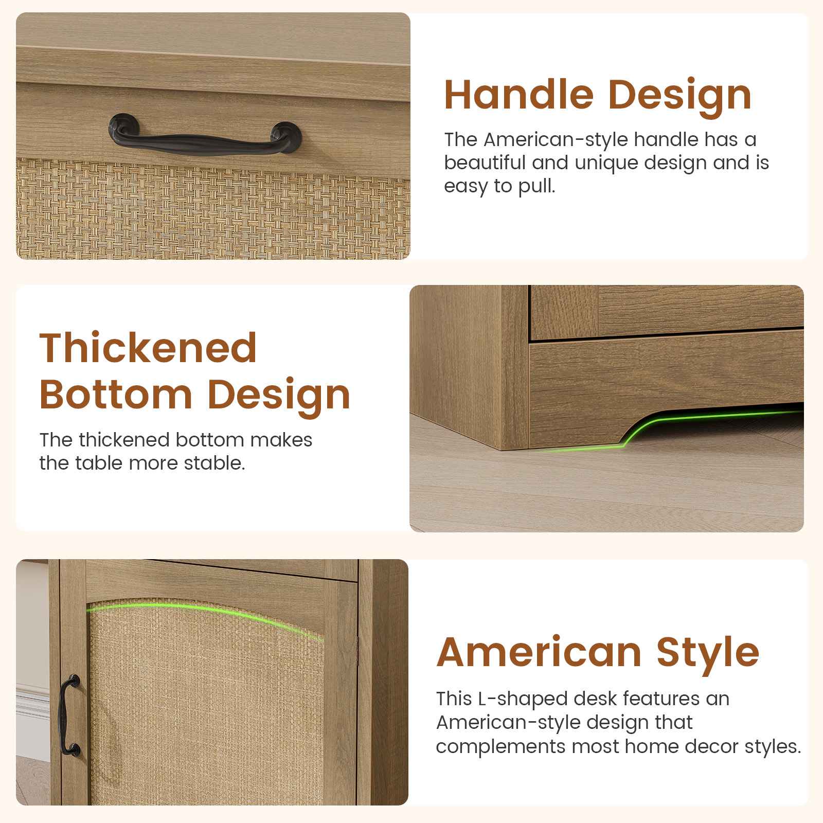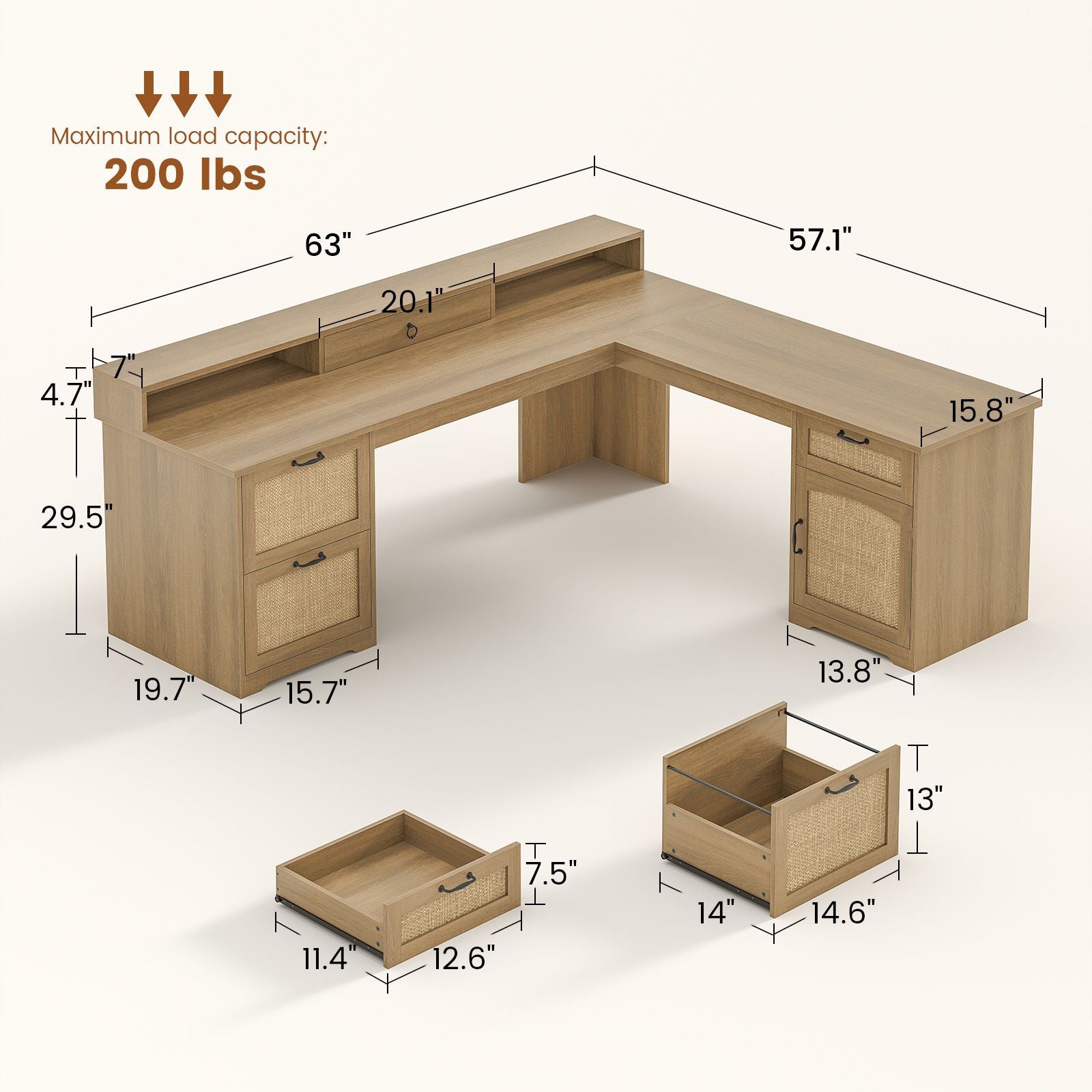 SEDETA 63 Inch Rattan Wood L Shaped Computer Desk Farmhouse Corner Executive Office Desk with File Drawers Monitor Stand Storage Cabinet