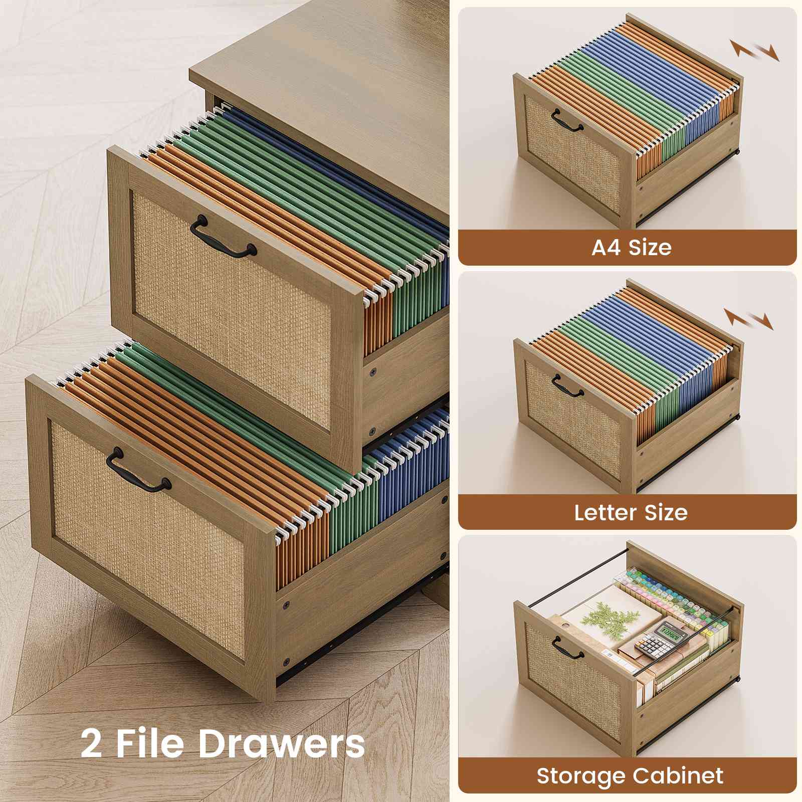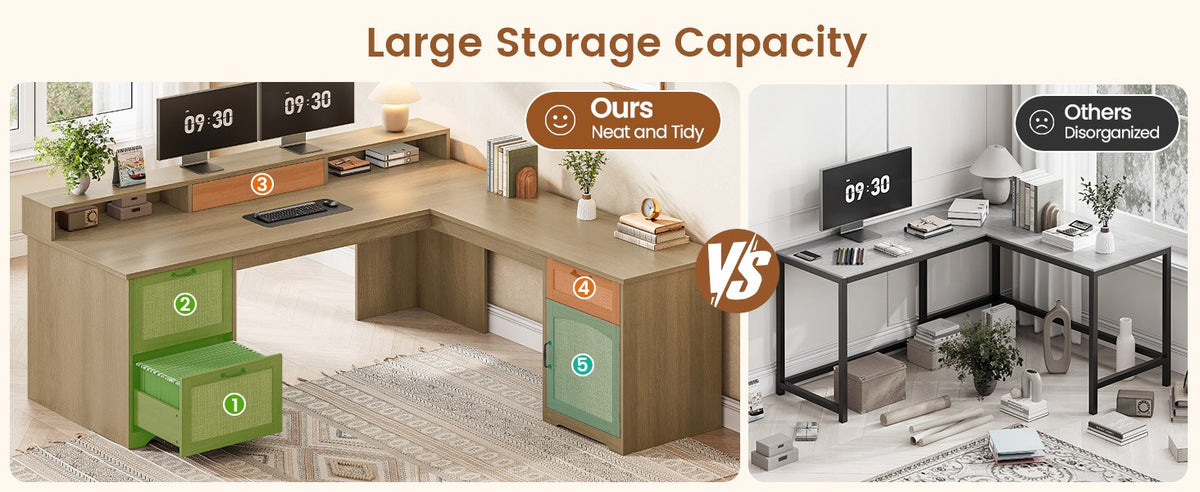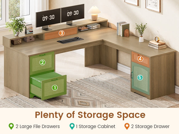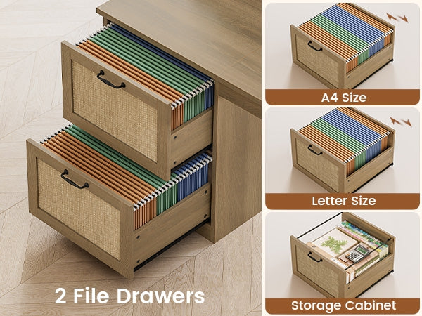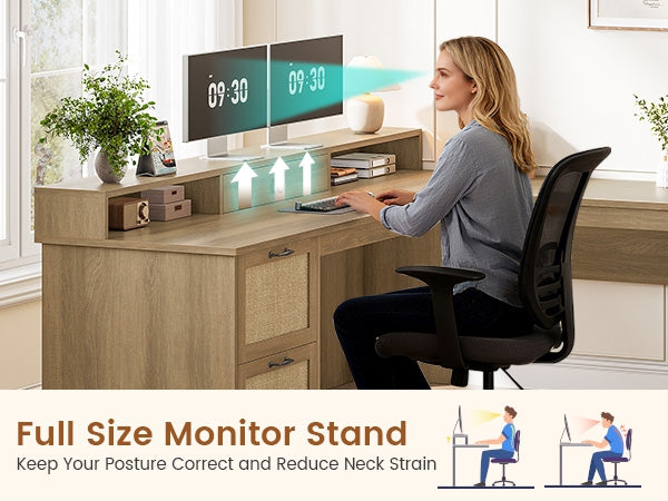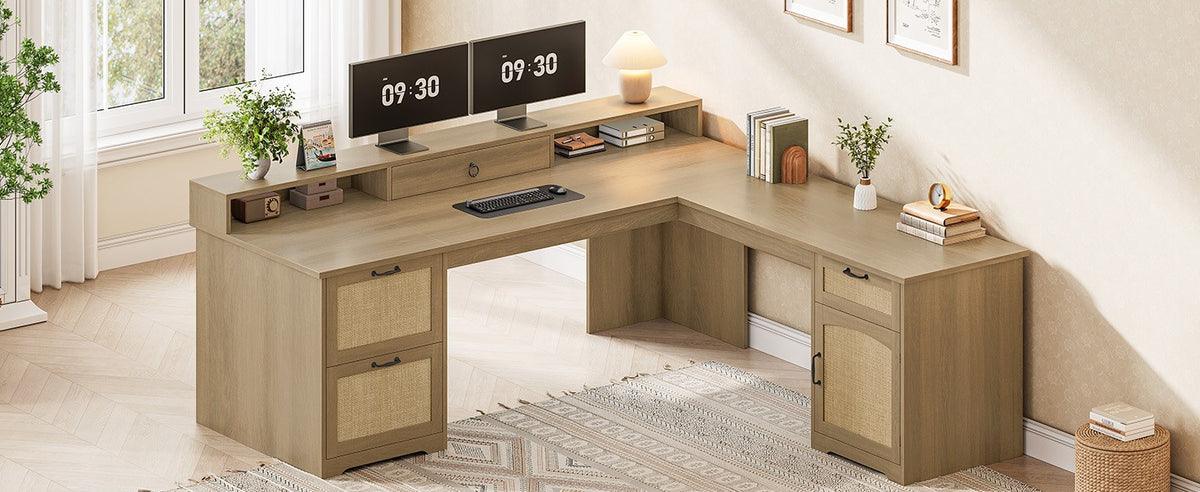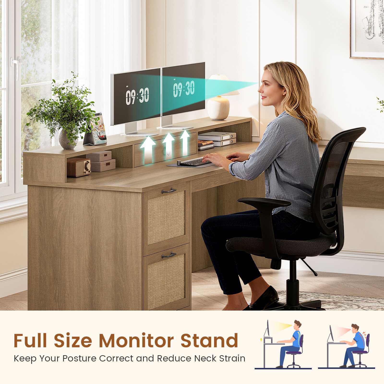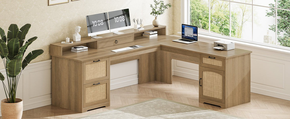 SEDETA 63 Inch Rattan Wood L Shaped Computer Desk Farmhouse Corner Executive Office Desk with File Drawers Monitor Stand Storage Cabinet