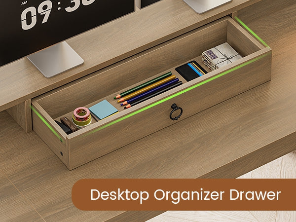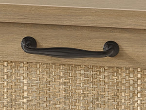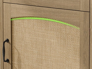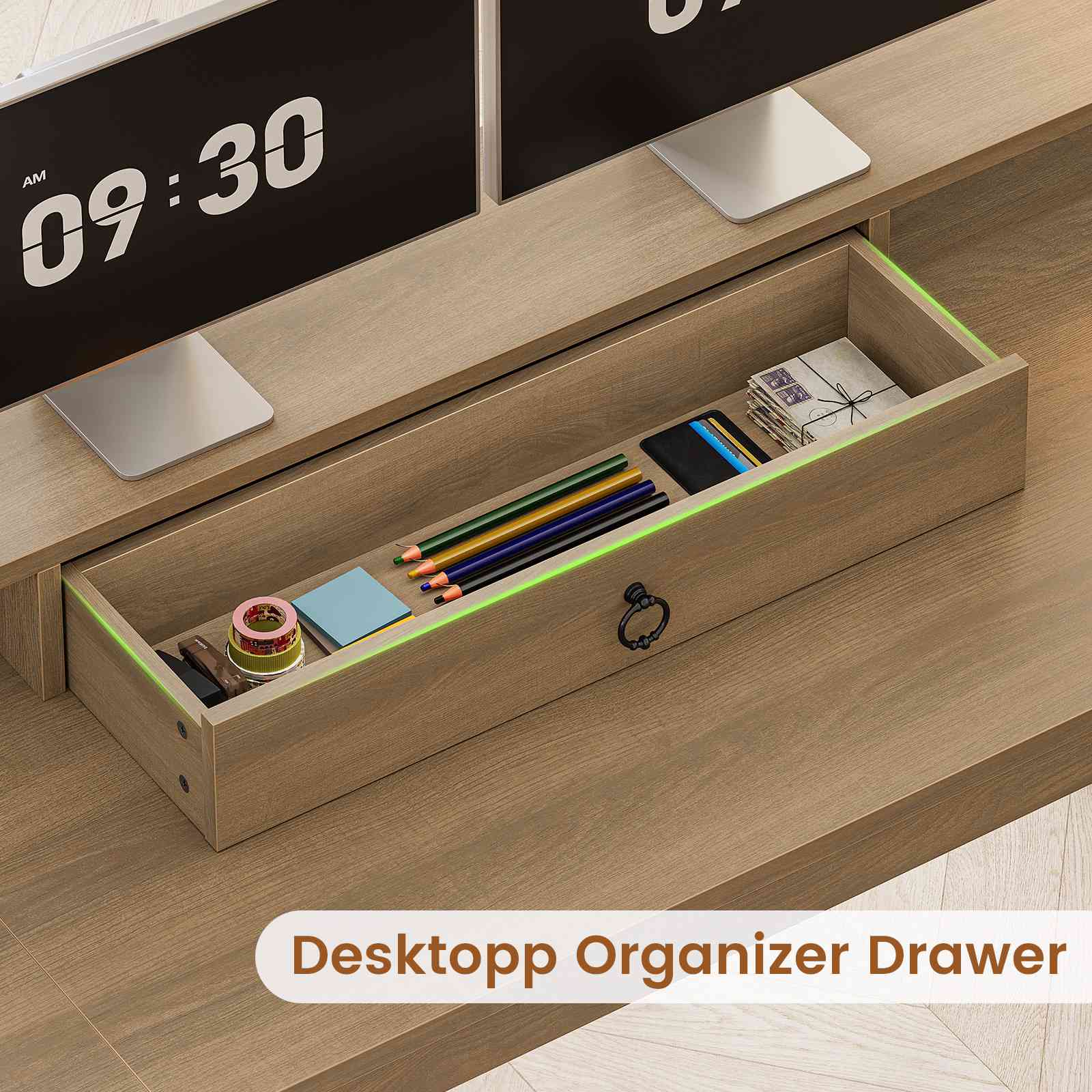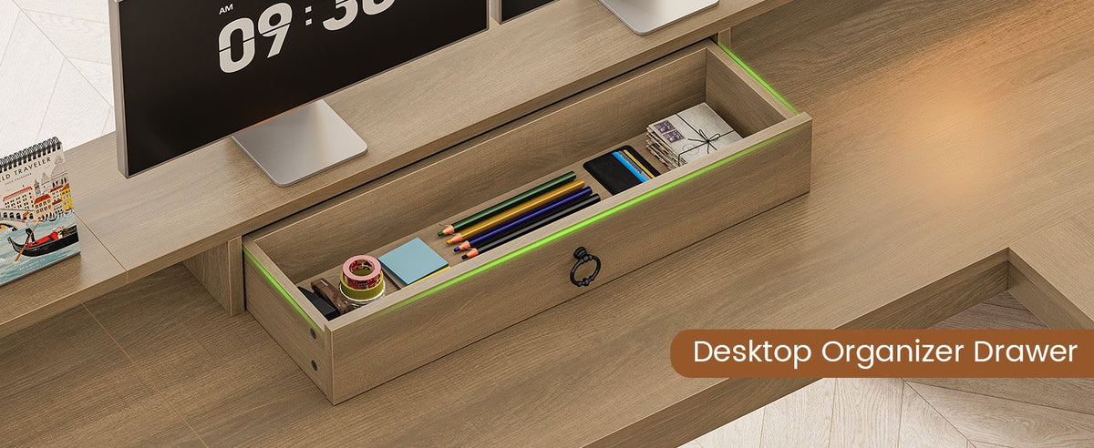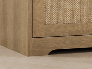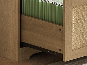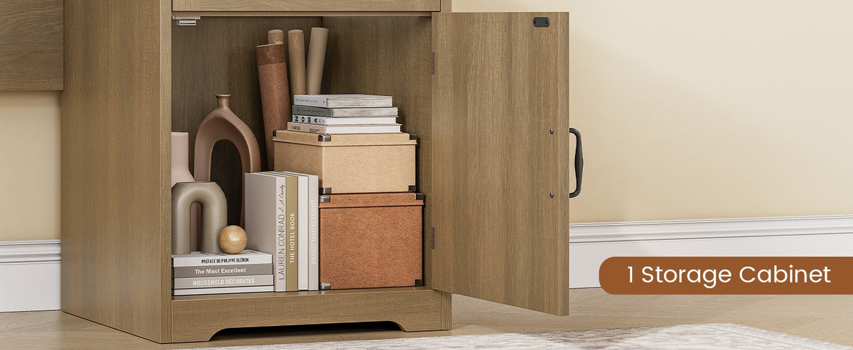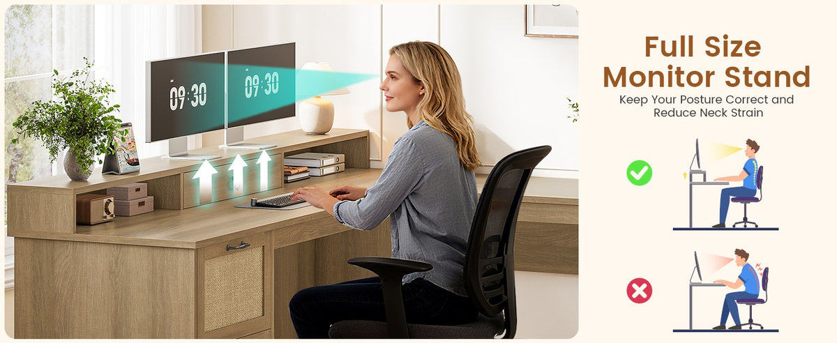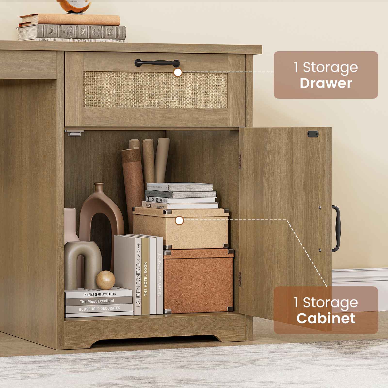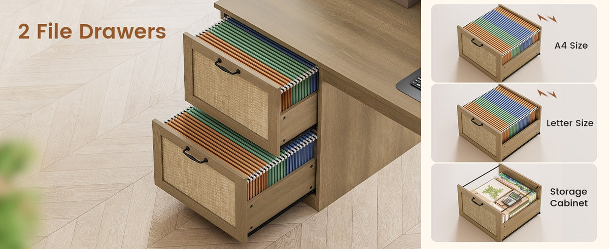 SEDETA 63 Inch Rattan Wood L Shaped Computer Desk Farmhouse Corner Executive Office Desk with File Drawers Monitor Stand Storage Cabinet