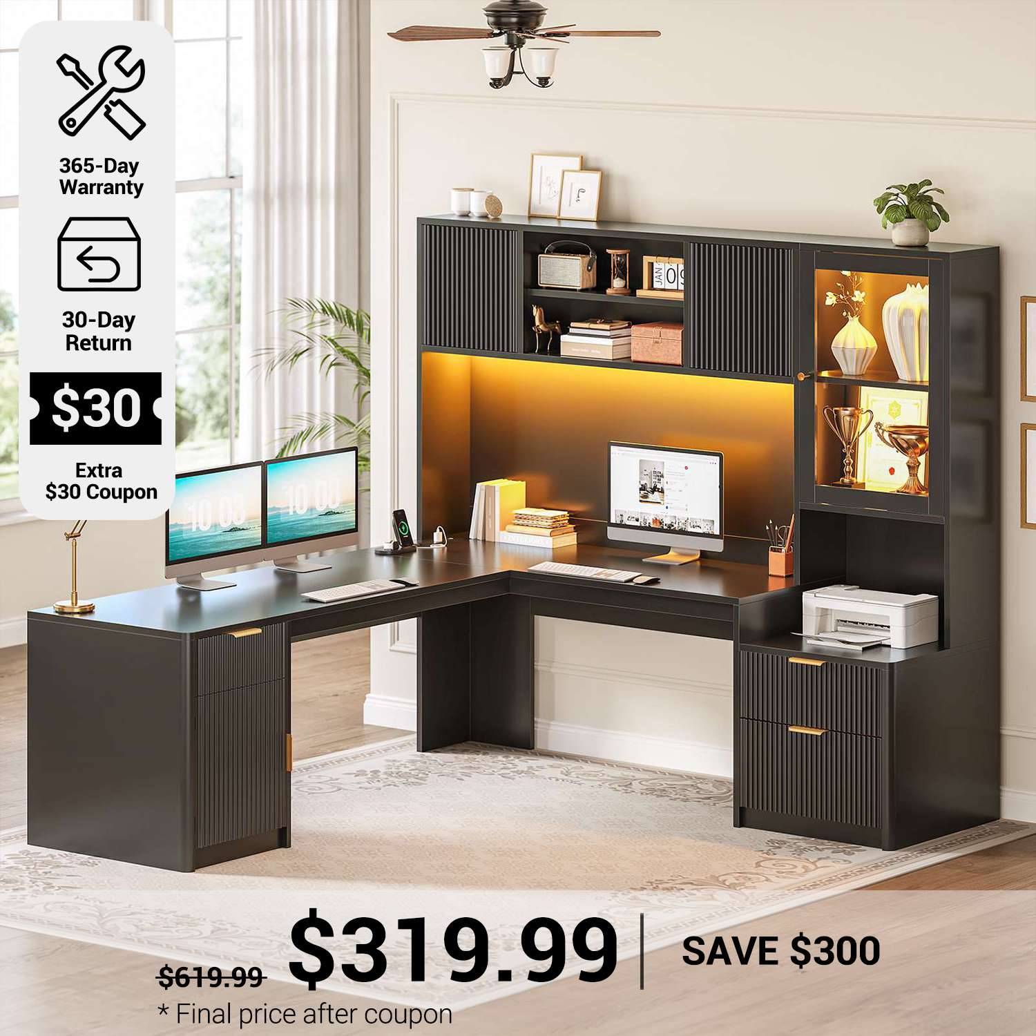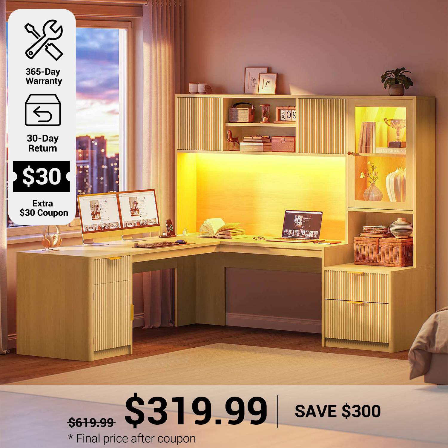 【Ultra-Spacious L-Shaped Desktop】This L-shaped computer desk offers an ample and comfortable working surface, easily accommodating multiple monitors, laptops, gaming setups, office supplies and study items. It provides plenty of room for daily work, gaming, studying and creative tasks, keeping your essentials within reach and creating a comfortable and efficient workstation for your home office, bedroom or study. 【Large Storage System】Designed with a 65" wide hutch and multi-functional storage compartments, this desk keeps your space neat and organized. It comes with 3 drawers: 1 specialized file drawer that fully fits Legal, Letter and A4 size documents for efficient file management, plus 2 extra storage drawers for private supplies. It also includes fluted-door closed cabinets, a clear glass display cabinet, open storage shelves, and a cabinet with adjustable shelf, providing dedicated space for your printer, books, trophies, collectibles and daily office supplies. 【Dynamic RGB LED Lighting System】Upgrade your workstation with the dynamic RGB LED lighting system, which supports both APP and button control. It offers over 60,000 customizable colors, music sync mode, timing function and multiple lighting effects, allowing you to create the perfect vibe for working, gaming or displaying your collections. The LED strips are installed on the hutch backboard and inside the glass display cabinet, highlighting your collections while building an immersive gaming or working environment. 【Built-in Power Outlet & Charging Station】Say goodbye to messy extension cords and hard-to-reach sockets! This office desk is equipped with a built-in power strip on the desktop, featuring 4 AC outlets (120V/12A), 2 USB charging ports (5V/2A), a master power switch, and a 5-foot long power cord. It lets you charge your computer, monitor, smartphone, tablet, gaming headset and other electronic devices right at your fingertips, keeping your desktop clean and organized all the time. 【Durable Build & Modern Stylish Design】Crafted with an FSC-certified wood frame and high-quality, scratch-resistant and water-proof wood grain board, this desk is built for long-term use with excellent stability and durability while adhering to eco-friendly standards. The premium smooth drawer slides ensure quiet and effortless opening and closing, while the adjustable foot pads keep the desk stable even on uneven floors. The fluted panel doors with gold handles bring a modern and elegant look, seamlessly matching various home decor styles. It ships in 2 separate boxes for safer delivery. 【Wide Versatility & Hassle-Free Assembly】This versatile L-shaped desk perfectly combines the needs of home office work and gaming entertainment, making it a great fit for your bedroom, study room, game room, home office or studio. We provide a detailed step-by-step instruction manual, numbered parts, and all necessary assembly tools in the package, making the installation process straightforward and time-saving. We also offer professional after-sales support to solve any problems you may encounter during assembly and use.