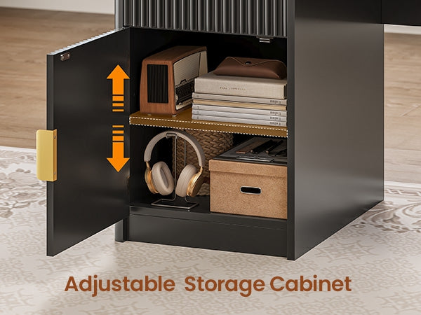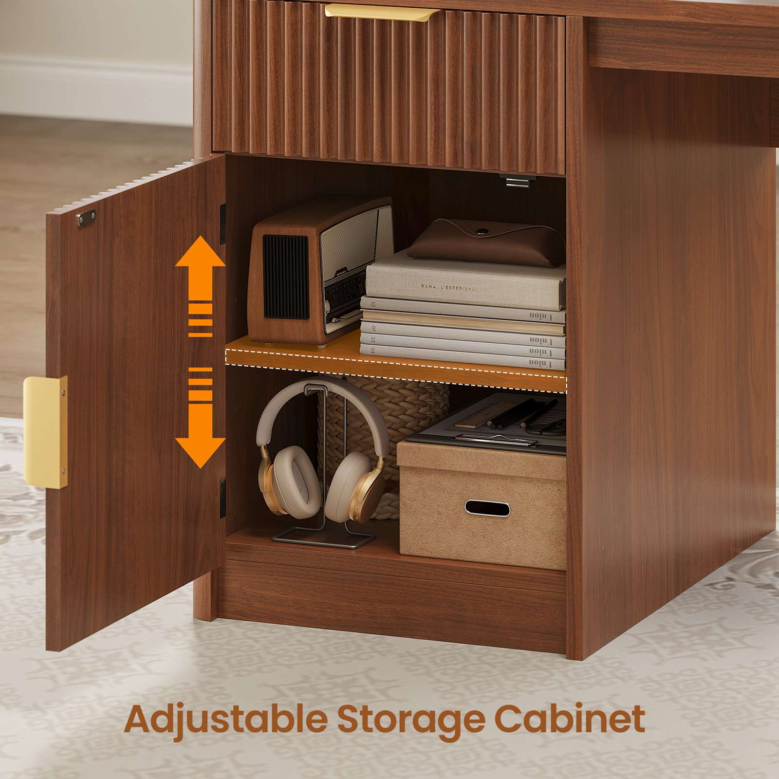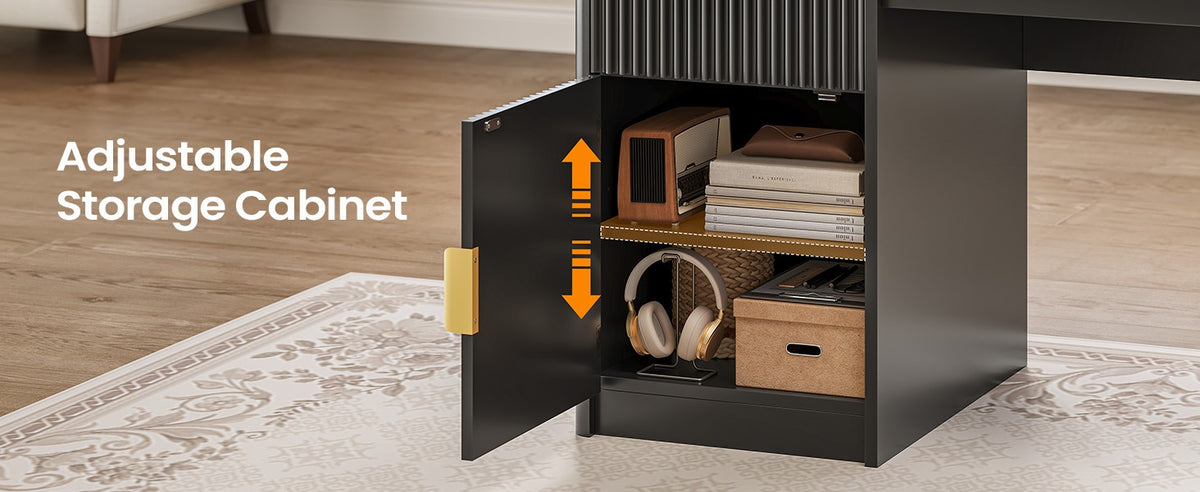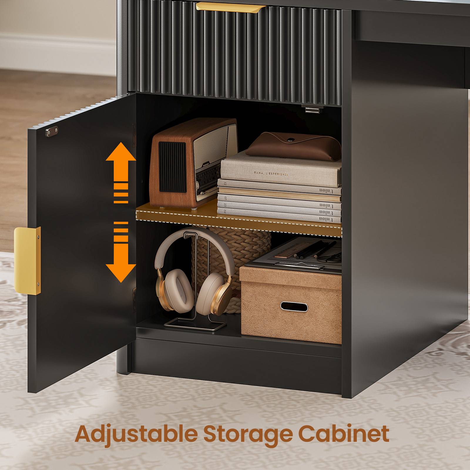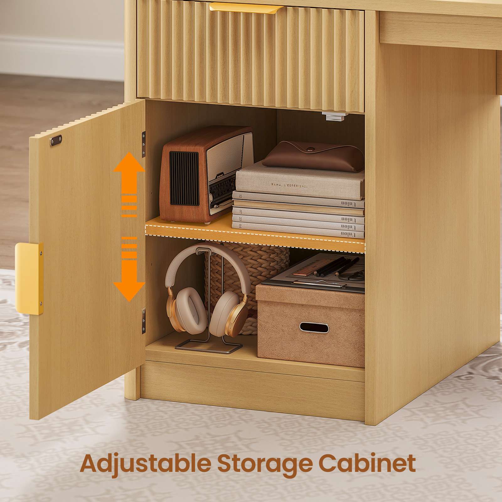 •【Durable Build & Modern Stylish Design】Crafted with an FSC-certified wood frame and high-quality, scratch-resistant and water-proof wood grain board, this desk is built for long-term use with excellent stability and durability while adhering to eco-friendly standards. The premium smooth drawer slides ensure quiet and effortless opening and closing, while the adjustable foot pads keep the desk stable even on uneven floors. The fluted panel doors with gold handles bring a modern and elegant look, seamlessly matching various home decor styles. It ships in 2 separate boxes for safer delivery.