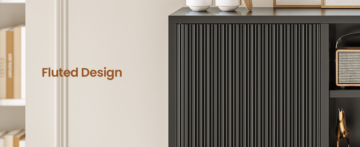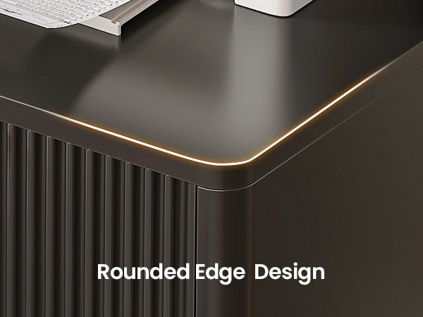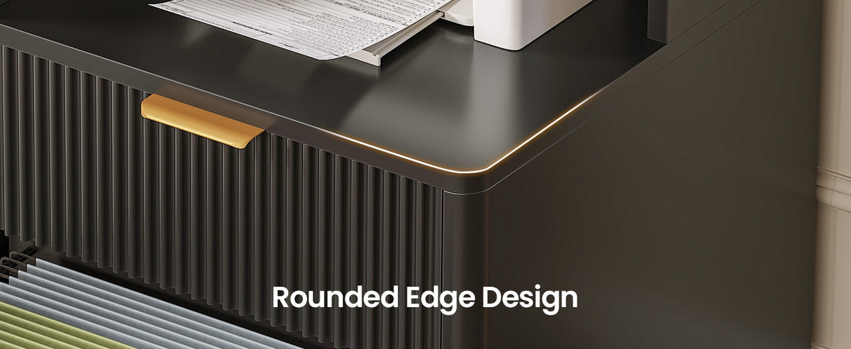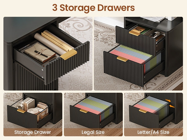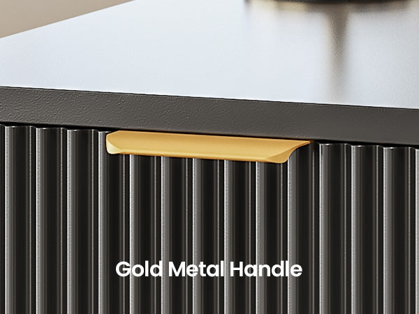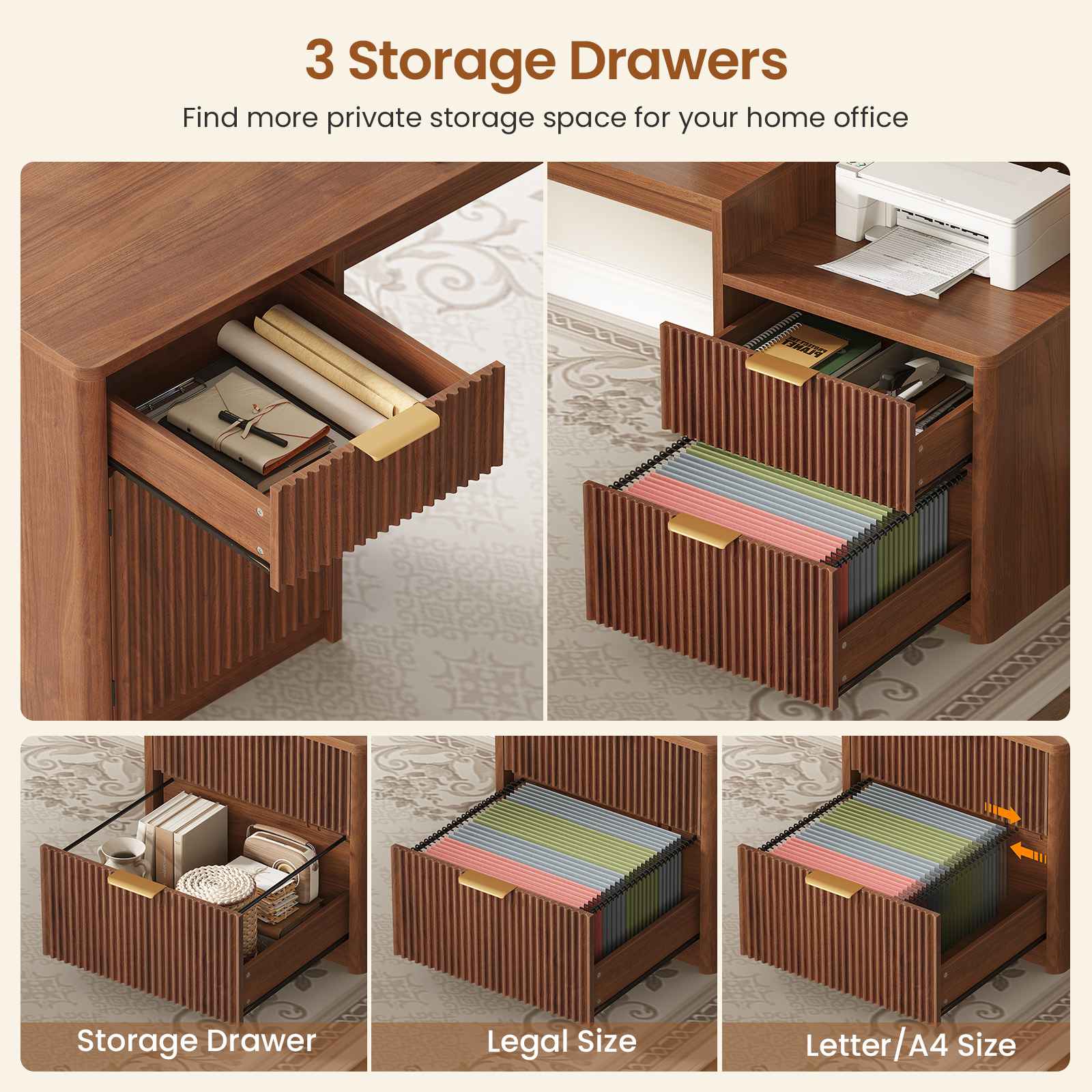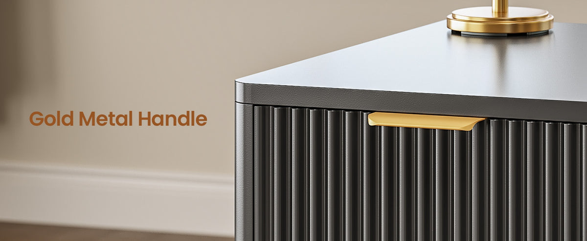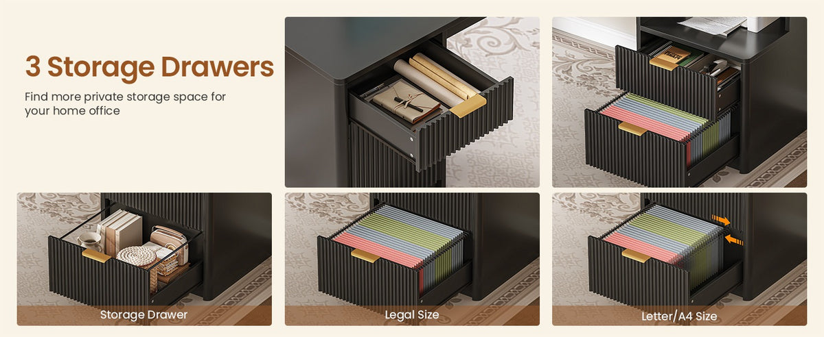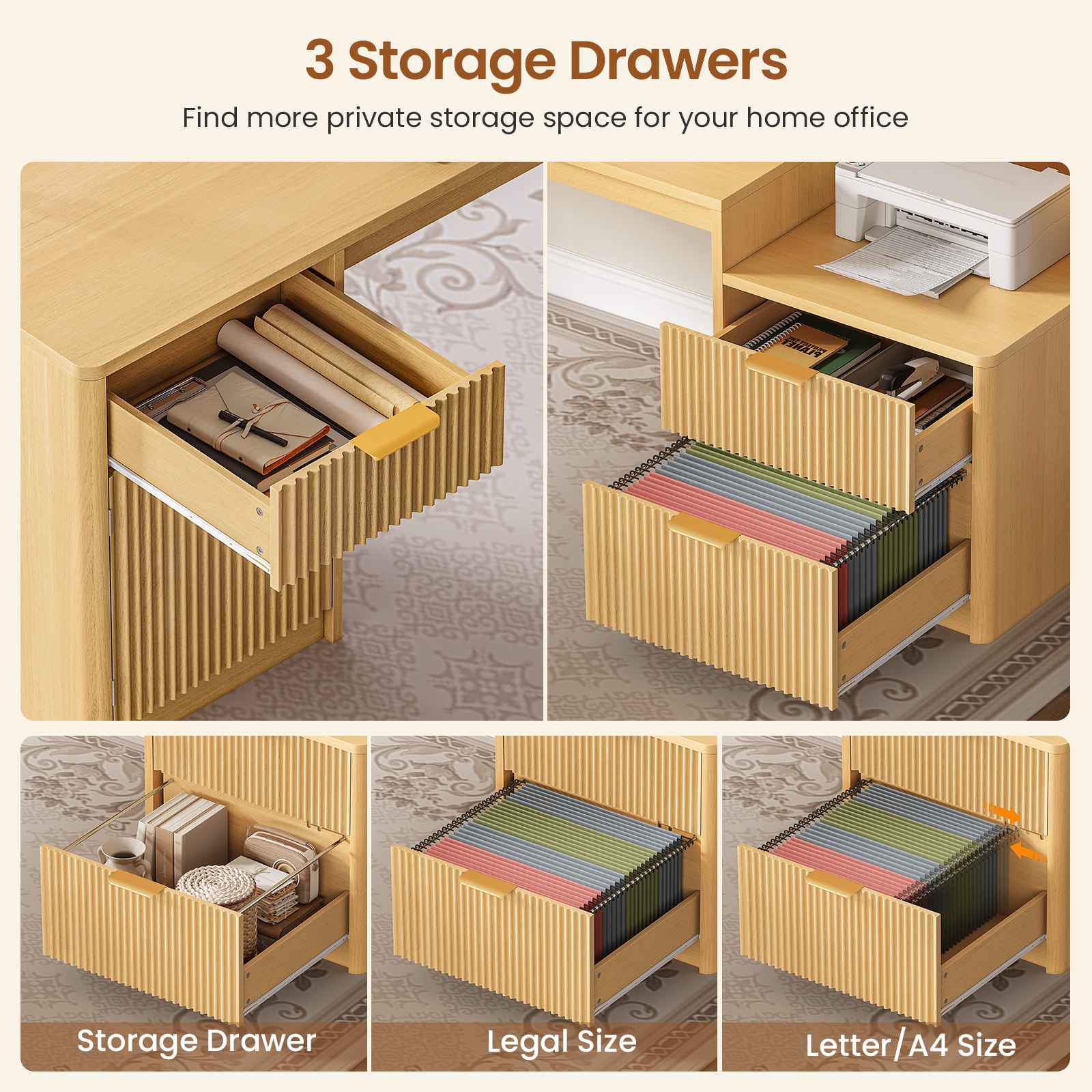 •【Durable Build & Modern Stylish Design】Crafted with an FSC-certified wood frame and high-quality, scratch-resistant and water-proof wood grain board, this desk is built for long-term use with excellent stability and durability while adhering to eco-friendly standards. The premium smooth drawer slides ensure quiet and effortless opening and closing, while the adjustable foot pads keep the desk stable even on uneven floors. The fluted panel doors with gold handles bring a modern and elegant look, seamlessly matching various home decor styles. It ships in 2 separate boxes for safer delivery.