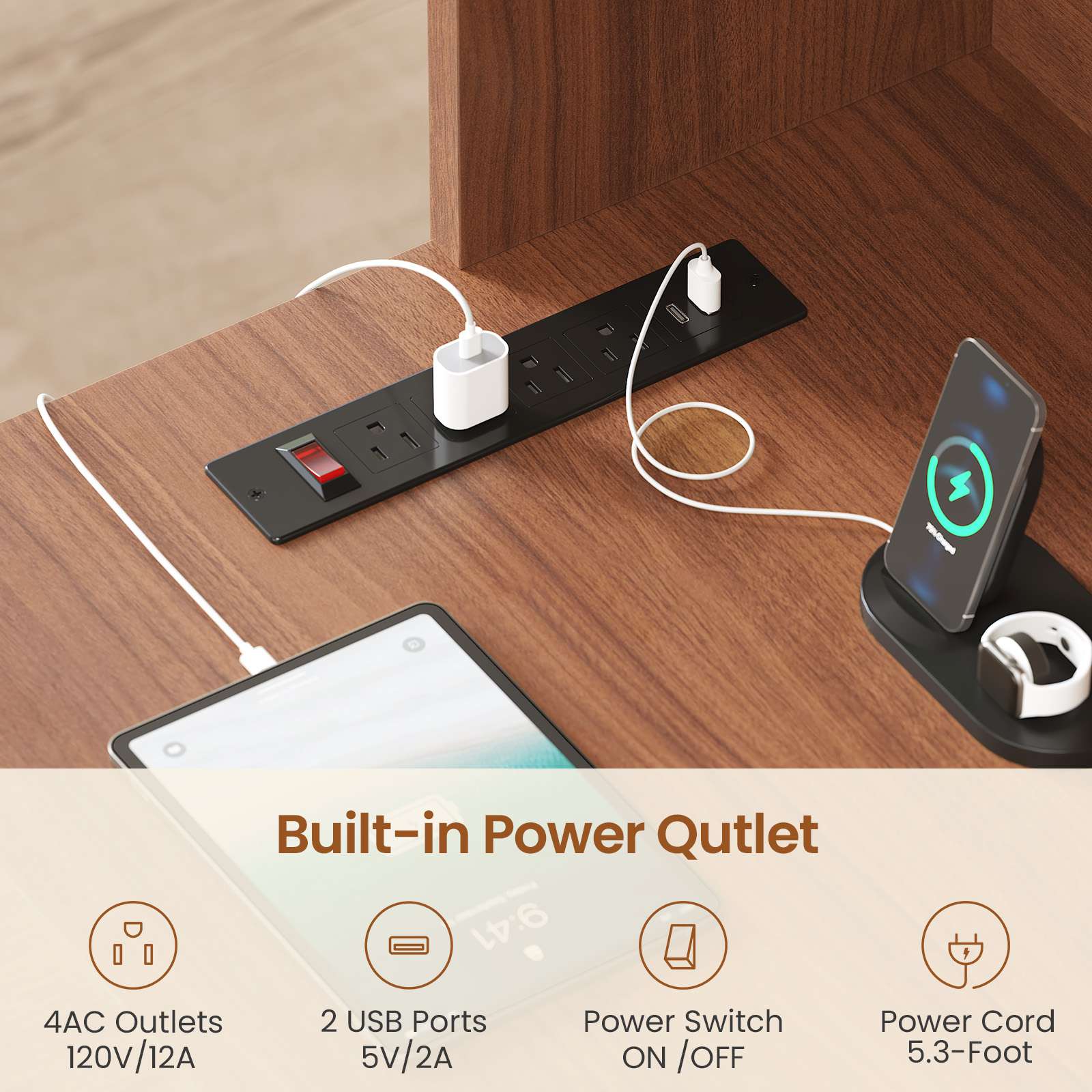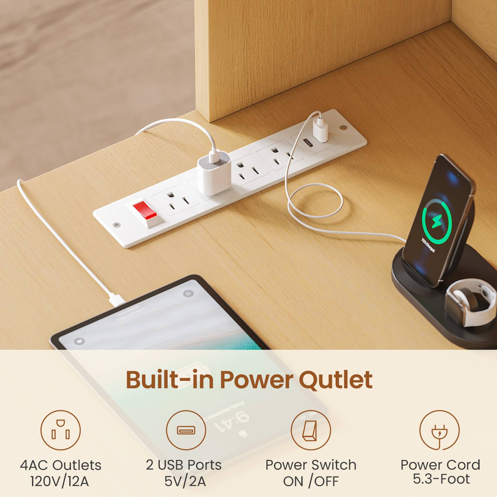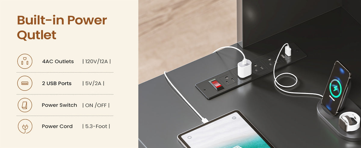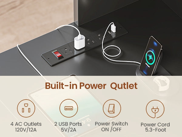 •【Built-in Power Outlet & Charging Station】Say goodbye to messy extension cords and hard-to-reach sockets! This office desk is equipped with a built-in power strip on the desktop, featuring 4 AC outlets (120V/12A), 2 USB charging ports (5V/2A), a master power switch, and a 5-foot long power cord. It lets you charge your computer, monitor, smartphone, tablet, gaming headset and other electronic devices right at your fingertips, keeping your desktop clean and organized all the time.