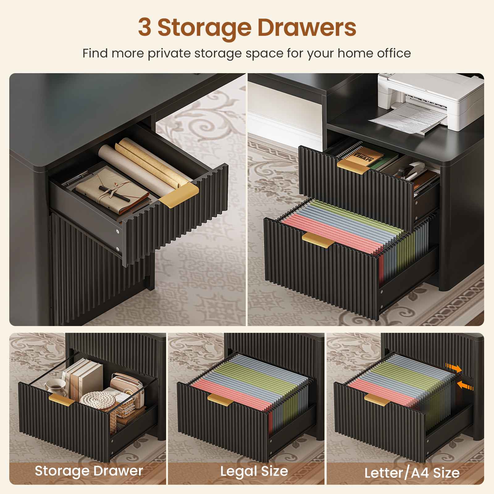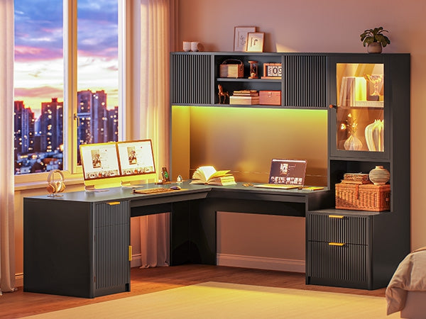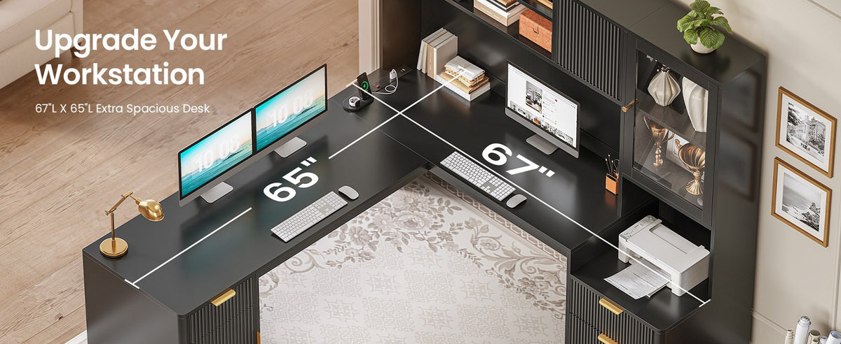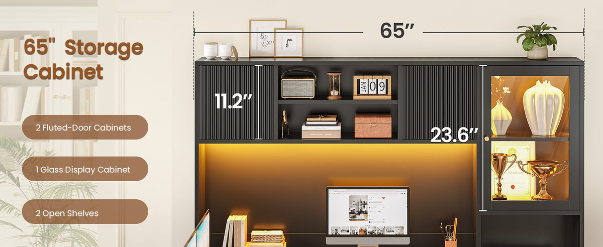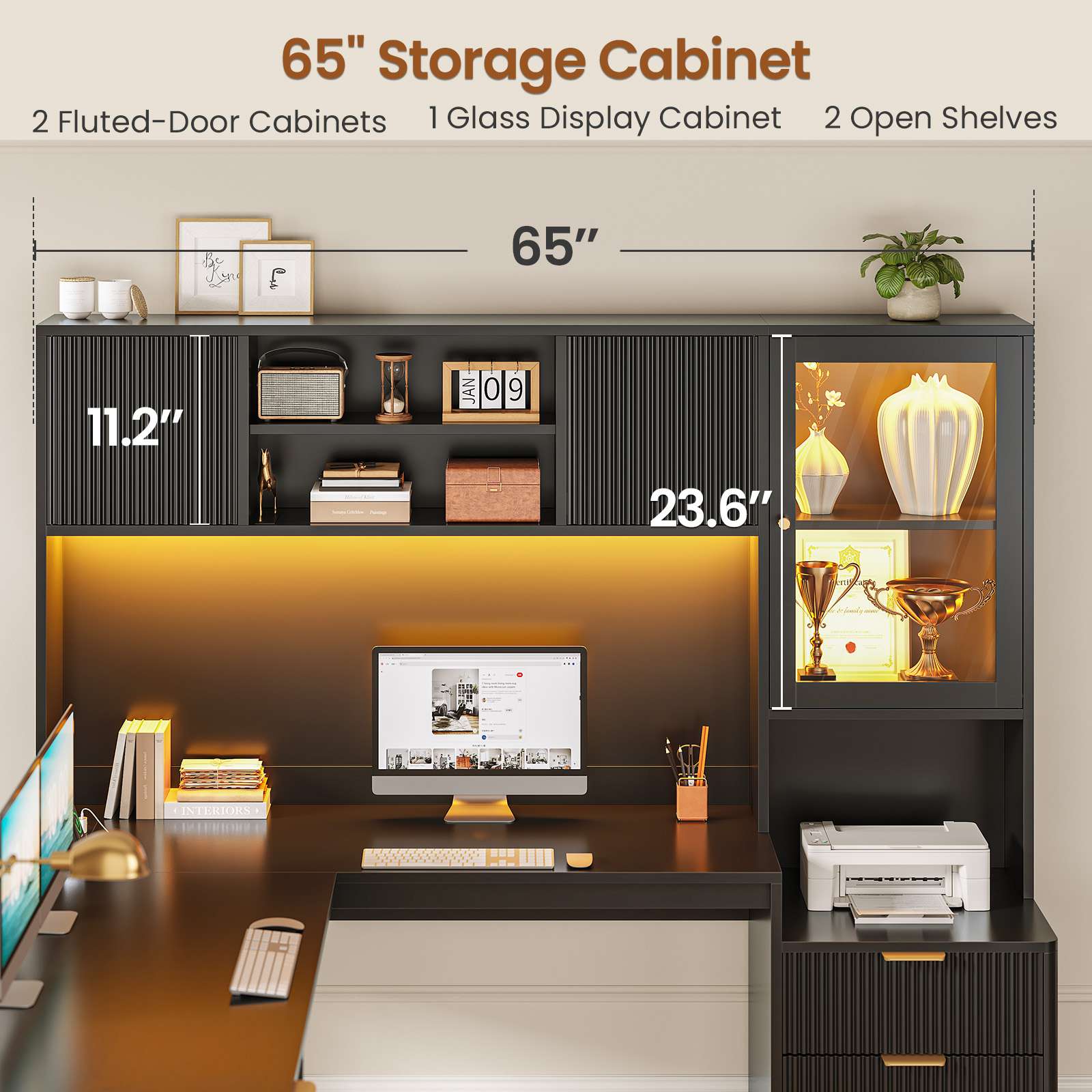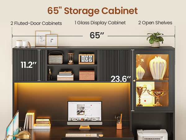 •【Large Storage System】Designed with a 65" wide hutch and multi-functional storage compartments, this desk keeps your space neat and organized. It comes with 3 drawers: 1 specialized file drawer that fully fits Legal, Letter and A4 size documents for efficient file management, plus 2 extra storage drawers for private supplies. It also includes fluted-door closed cabinets, a clear glass display cabinet, open storage shelves, and a cabinet with adjustable shelf, providing dedicated space for your printer, books, trophies, collectibles and daily office supplies.