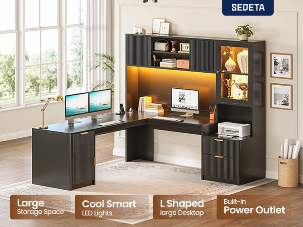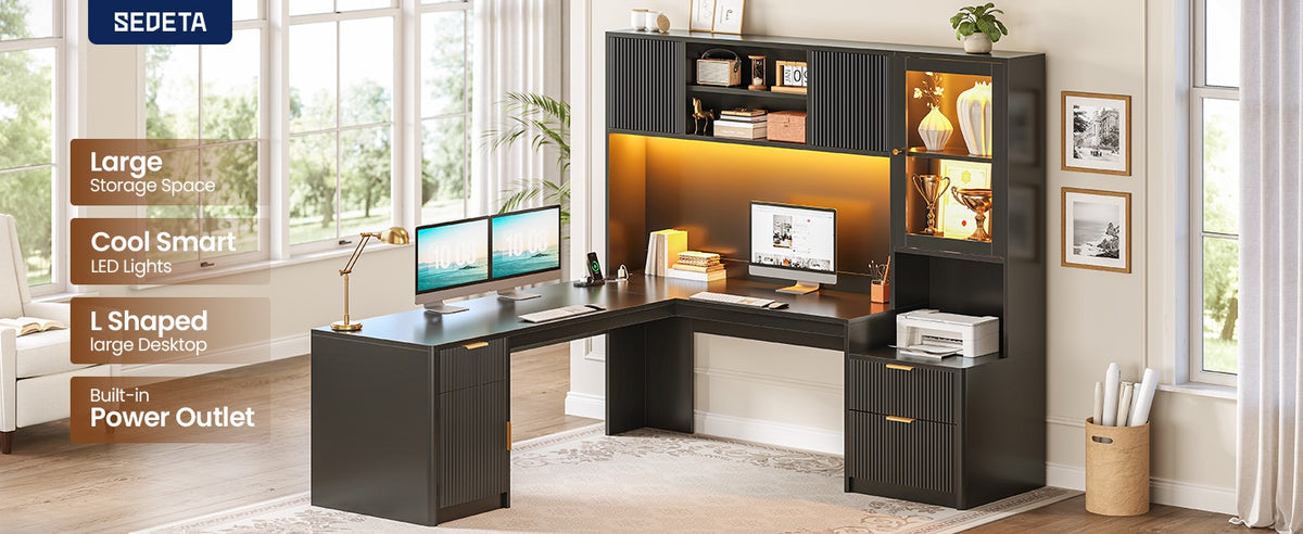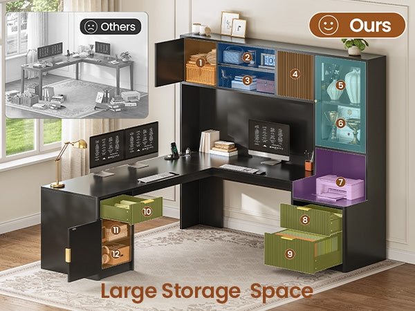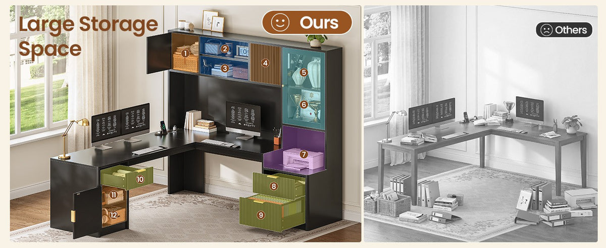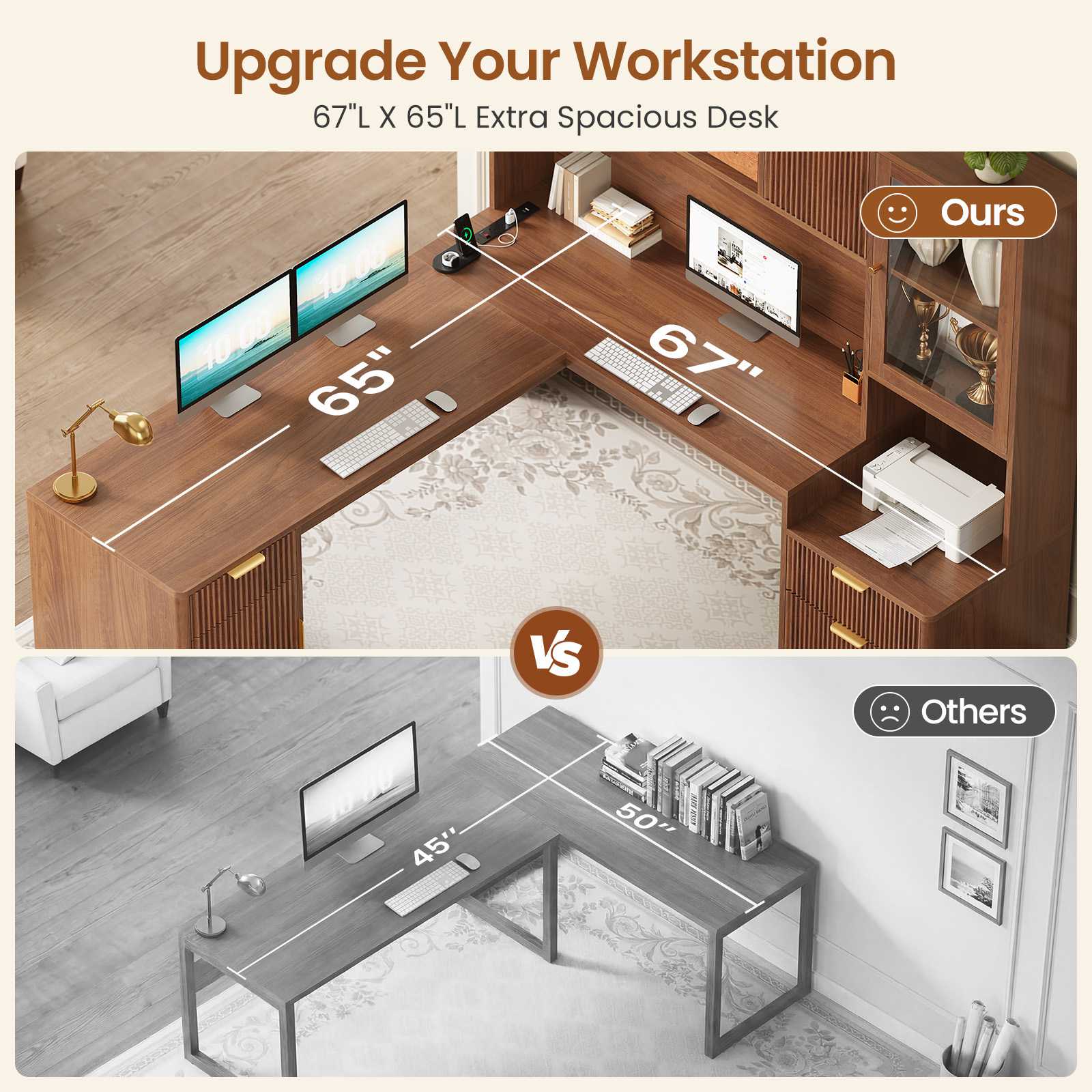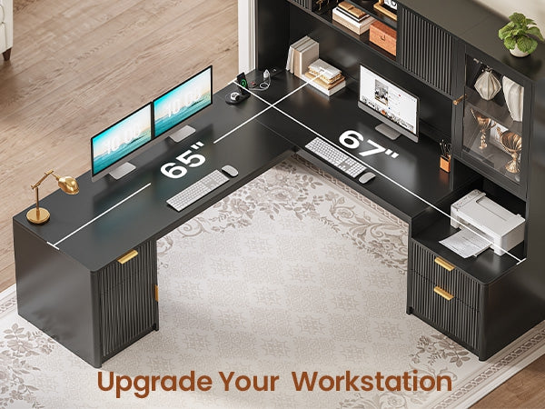•【Large Storage System】Designed with a 65" wide hutch and multi-functional storage compartments, this desk keeps your space neat and organized. It comes with 3 drawers: 1 specialized file drawer that fully fits Legal, Letter and A4 size documents for efficient file management, plus 2 extra storage drawers for private supplies. It also includes fluted-door closed cabinets, a clear glass display cabinet, open storage shelves, and a cabinet with adjustable shelf, providing dedicated space for your printer, books, trophies, collectibles and daily office supplies.