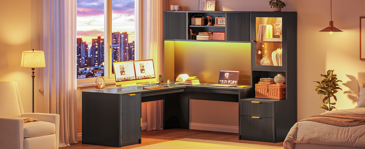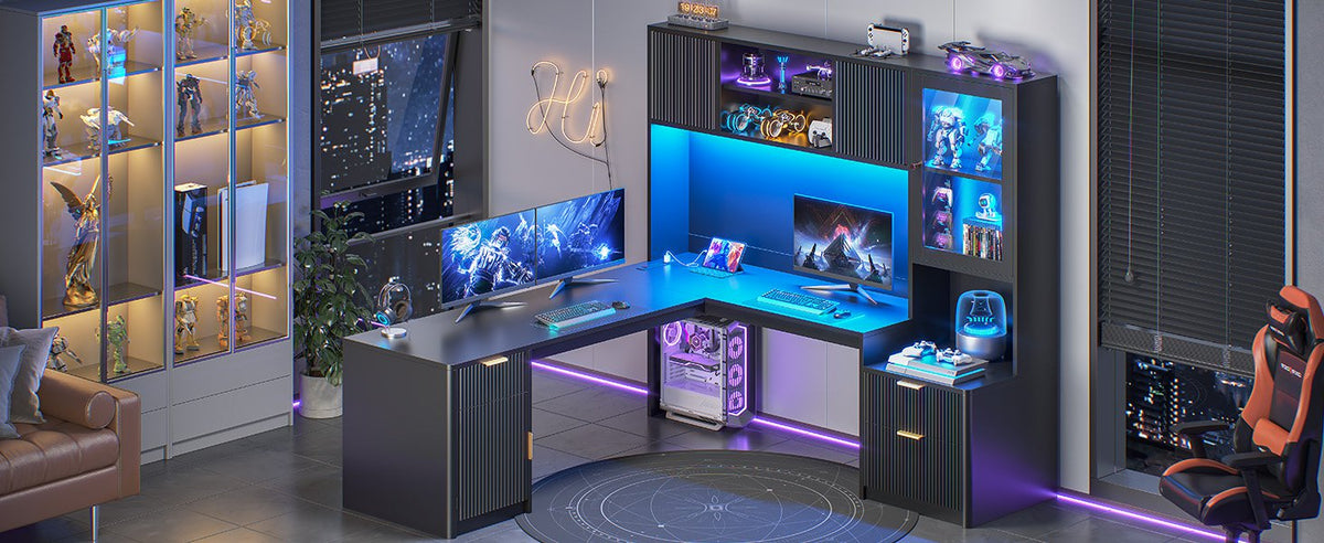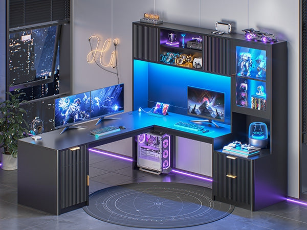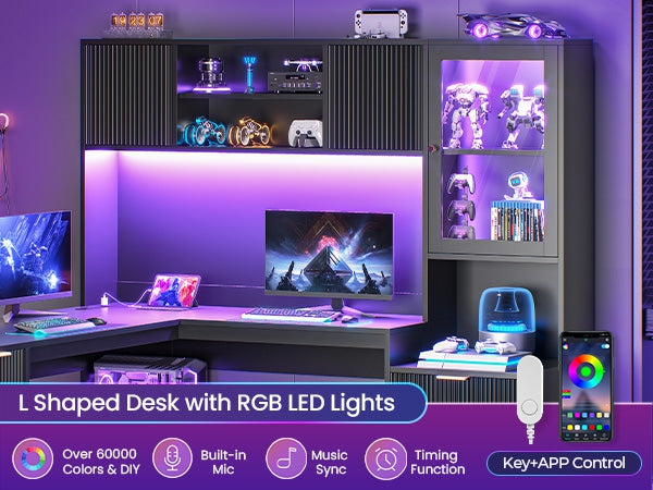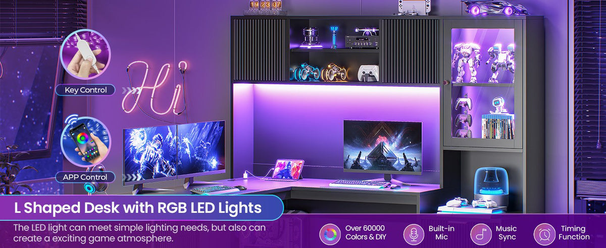•【Dynamic RGB LED Lighting System】Upgrade your workstation with the dynamic RGB LED lighting system, which supports both APP and button control. It offers over 60,000 customizable colors, music sync mode, timing function and multiple lighting effects, allowing you to create the perfect vibe for working, gaming or displaying your collections. The LED strips are installed on the hutch backboard and inside the glass display cabinet, highlighting your collections while building an immersive gaming or working environment.