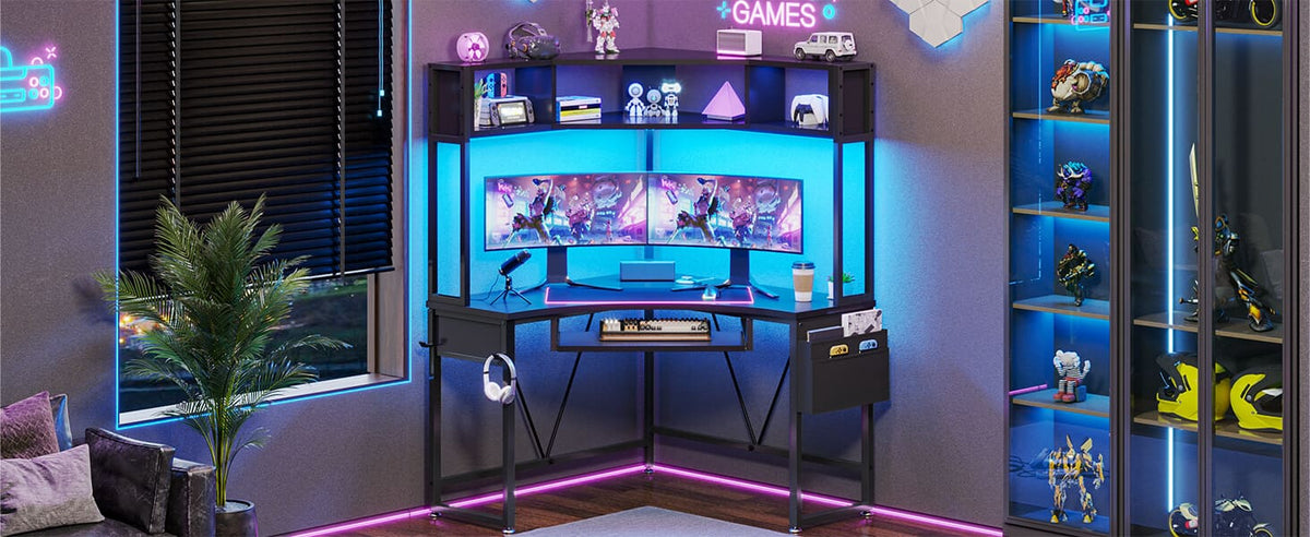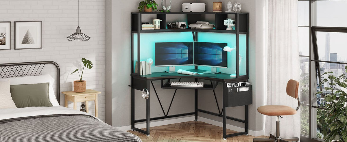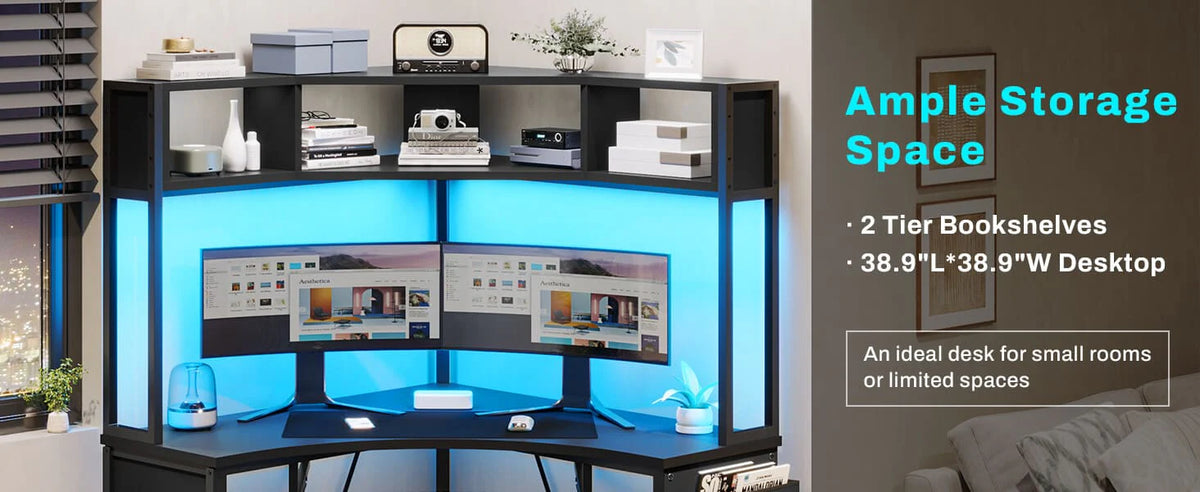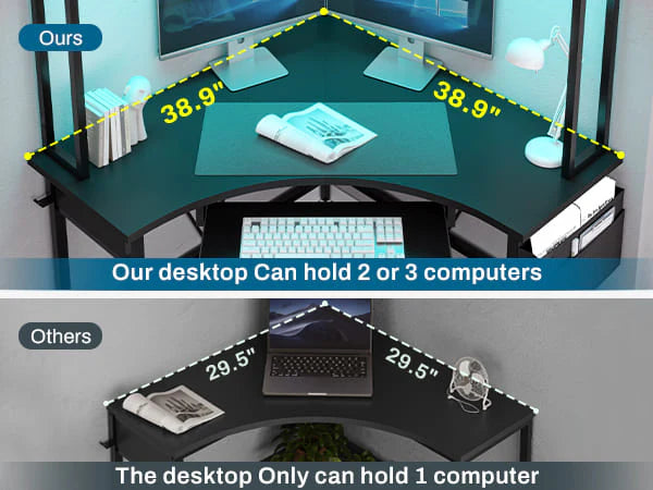 The decent layout corner computer desk has a large desktop, led strip, 2-tier storage shelves, keyboard tray, storage bag and headphone hook. 38.9"L*38.9" W Large work area can hold 2 or 3 desktop computers. This corner desk makes full use of your corner space, is very suitable for your bedroom corner space or sofa corner. If you need multiple computers to operate at the same time while working, and your home space is relatively small, this oversized corner desk is your best choice.