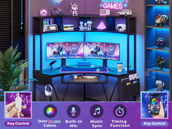•【Cool & Smart Led Light Strips 】The Sedeta corner gaming desk comes with RGB LED light strip, remote control via APP, Over 60000 colors and 29 flashing modes for your to choose. Led light strip with music sync function, built-in sensitivity adjustable mic, led light color will change with the rhythm of the sound and music. And with timer function, just enjoy it in a smart way, create gaming and working atmosphere. Light Up Your Gaming with LED Light Strip.