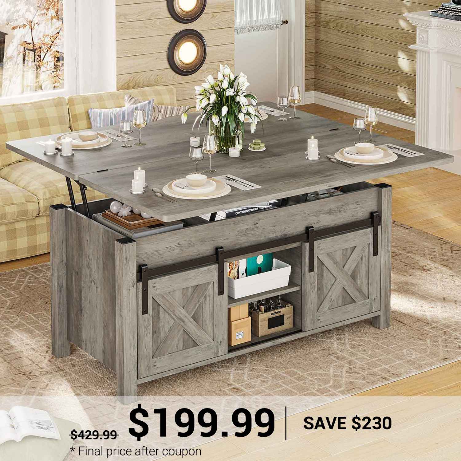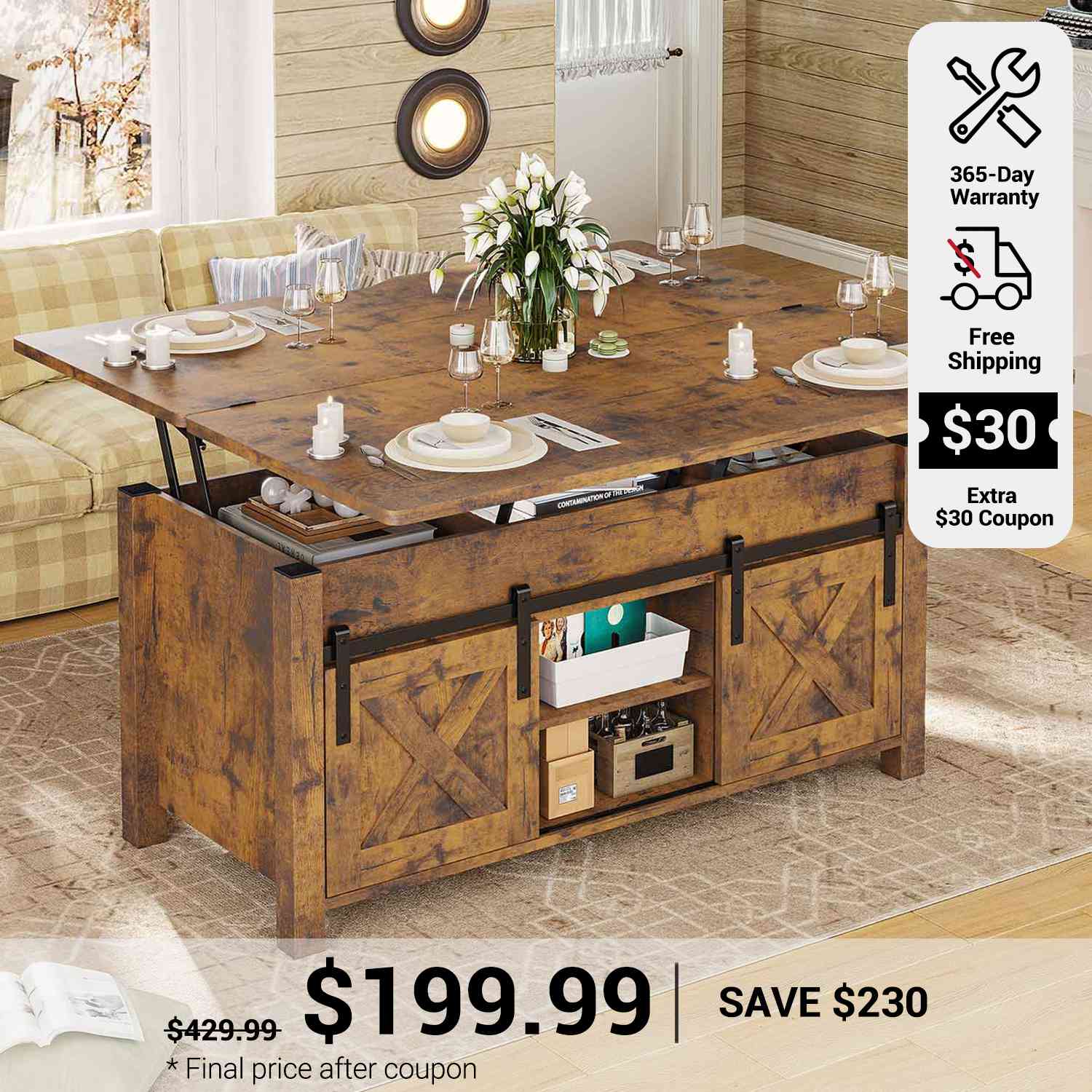 •【4-in-1 Lift Design】Unique lift top coffee table design to meet more needs--when fully unfolded, it becomes a dining or gaming coffee table for 8 people; when half expanded, it becomes a workstation for 2 people to use at the same time without disturbing each other; when lifting top is closed, farmhouse coffee table is suitable for storing sundries.