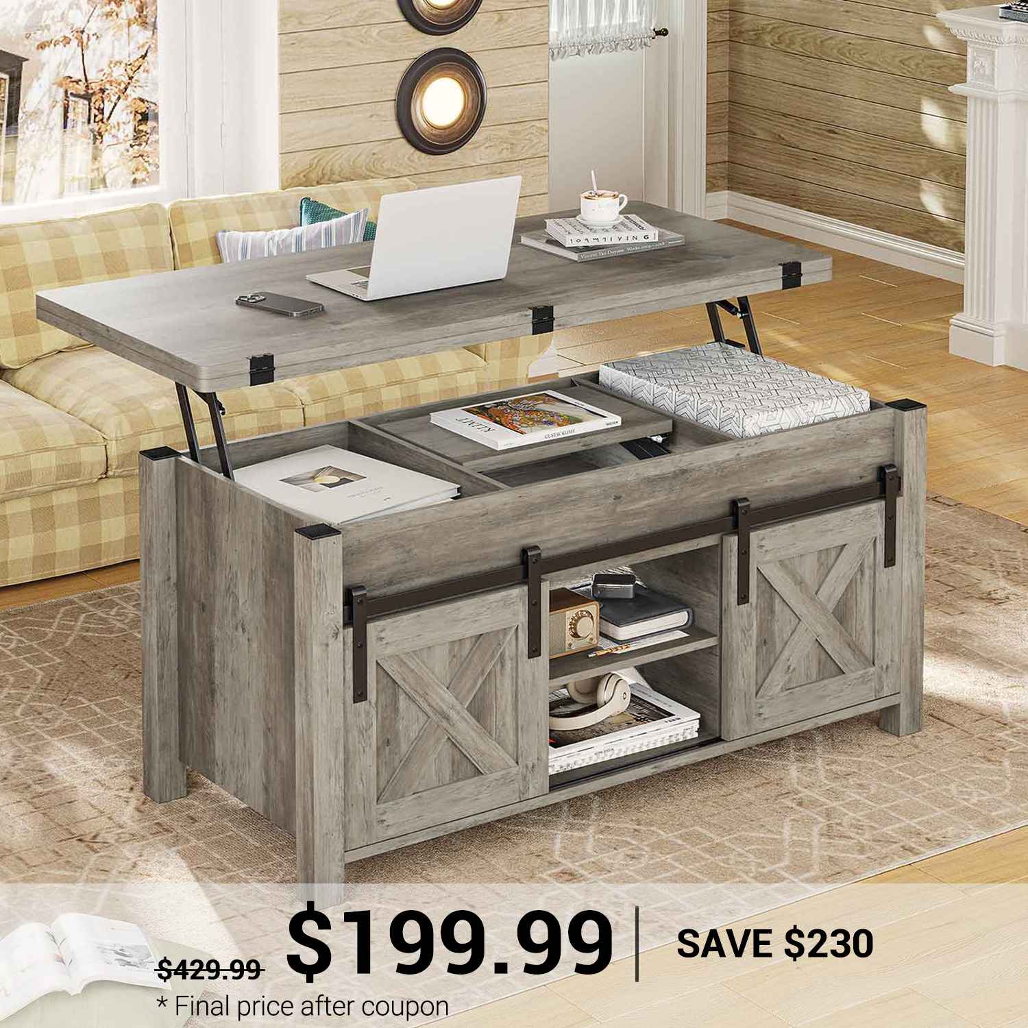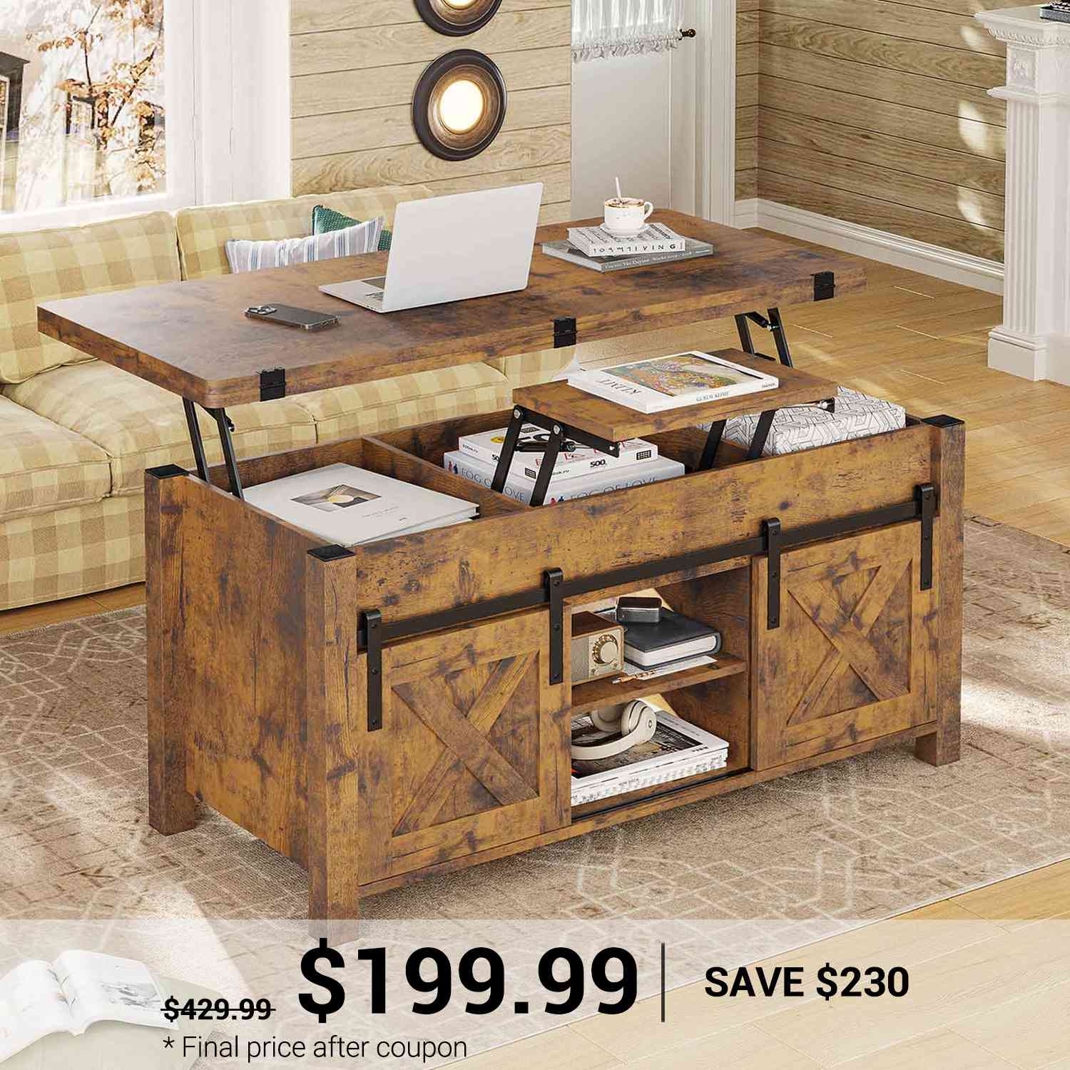 •【Large Storage Spaces】Beneath the handy lift-top surface are 3 hidden storage areas that provide you with the perfect spot to stow away any around-home essentials you typically wouldn't want your guests to see. The lower open storage shlef & 2 sliding barn doors can be placed laptop, chess, remote controllers or knick-knack. Keep your living space tidy and organized with this unique feature.