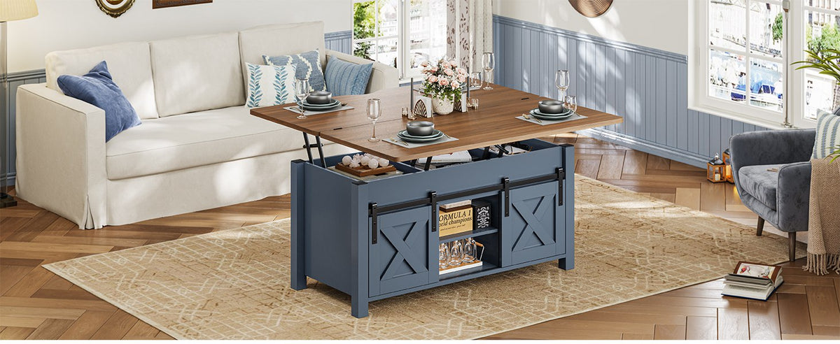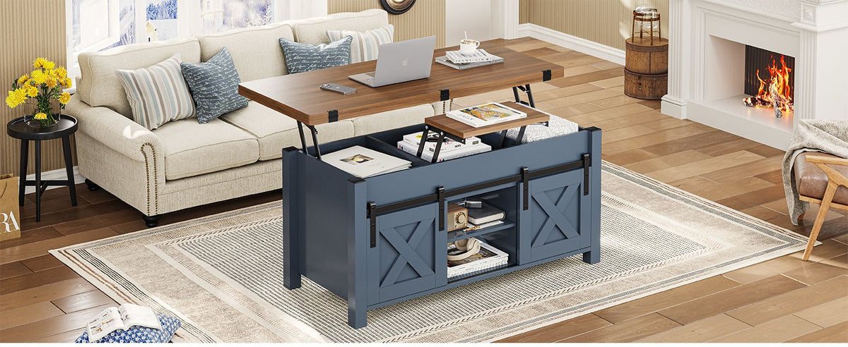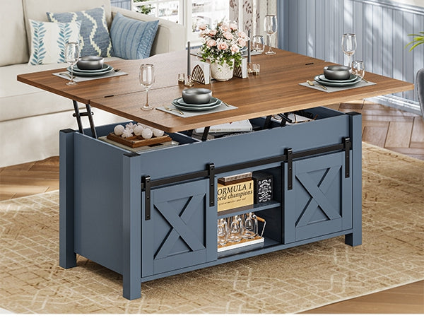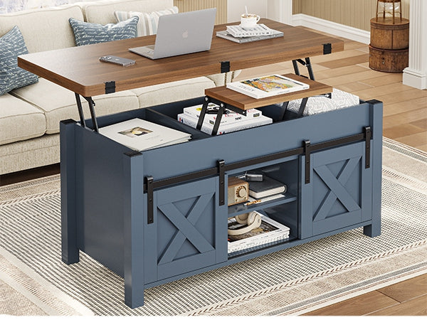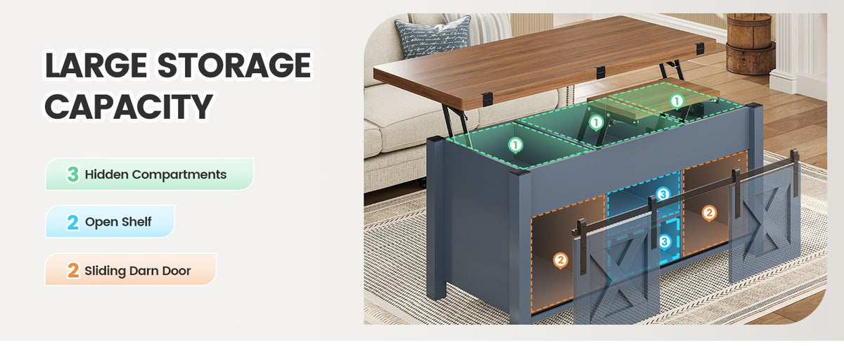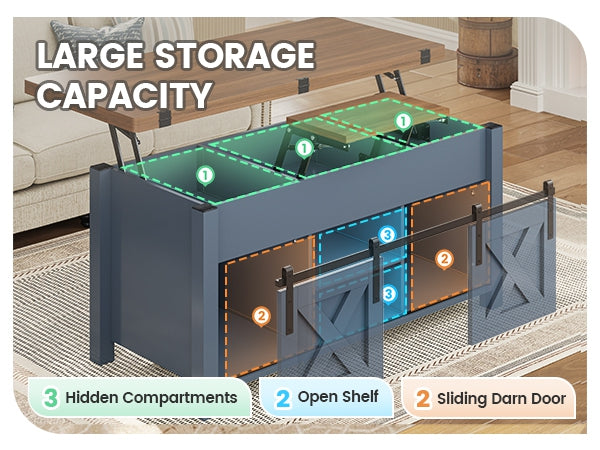 •【Large Storage Spaces】Beneath the handy lift-top surface are 3 hidden storage areas that provide you with the perfect spot to stow away any around-home essentials you typically wouldn't want your guests to see. The lower open storage shlef & 2 sliding barn doors can be placed laptop, chess, remote controllers or knick-knack. Keep your living space tidy and organized with this unique feature.