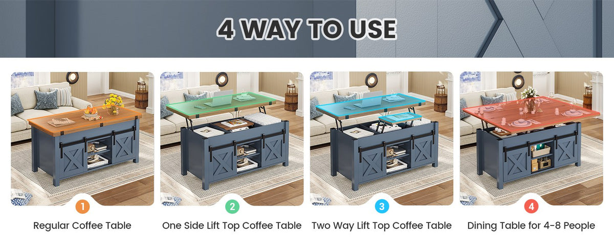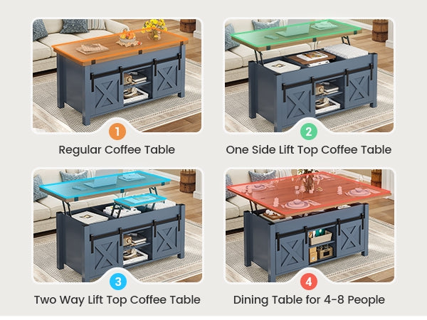 •【4-in-1 Lift Design】Unique lift top coffee table design to meet more needs--when fully unfolded, it becomes a dining or gaming coffee table for 8 people; when half expanded, it becomes a workstation for 2 people to use at the same time without disturbing each other; when lifting top is closed, farmhouse coffee table is suitable for storing sundries.